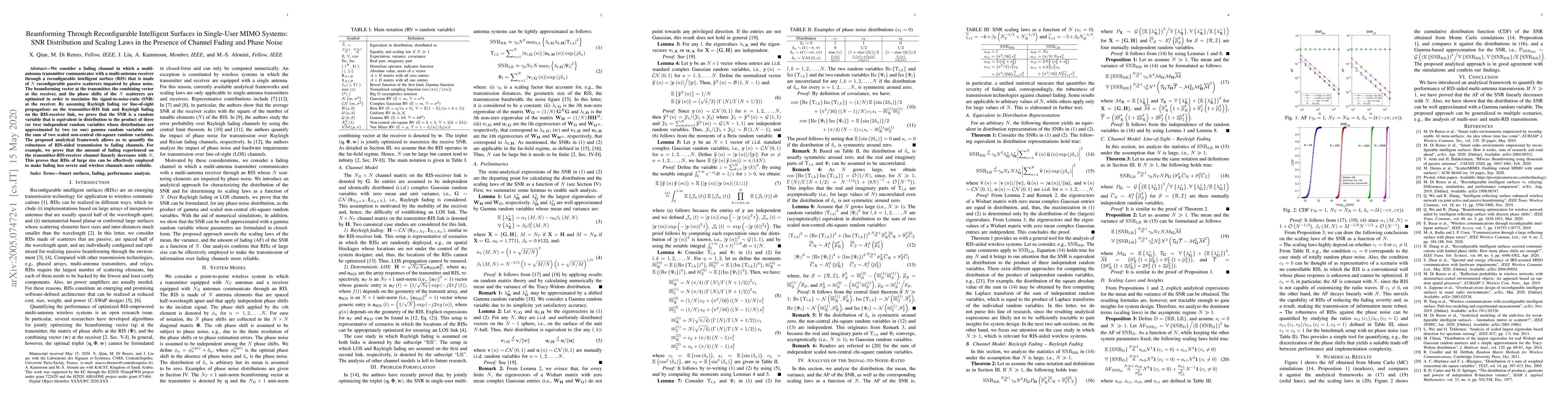 We consider a fading channel in which a multi-antenna transmitter communicates with a multi-antenna receiver through a reconfigurable intelligent surface (RIS) that is made of $N$ reconfigurable passive scatterers impaired by phase noise. The beamforming vector at the transmitter, the combining vector at the receiver, and the phase shifts of the $N$ scatterers are optimized in order to maximize the signal-to-noise-ratio (SNR) at the receiver. By assuming Rayleigh fading (or line-of-sight propagation) on the transmitter-RIS link and Rayleigh fading on the RIS-receiver link, we prove that the SNR is a random variable that is equivalent in distribution to the product of three (or two) independent random variables whose distributions are approximated by two (or one) gamma random variables and the sum of two scaled non-central chi-square random variables. The proposed analytical framework allows us to quantify the robustness of RIS-aided transmission to fading channels. For example, we prove that the amount of fading experienced on the transmitter-RIS-receiver channel linearly decreases with $N$. This proves that RISs of large size can be effectively employed to make fading less severe and wireless channels more reliable.