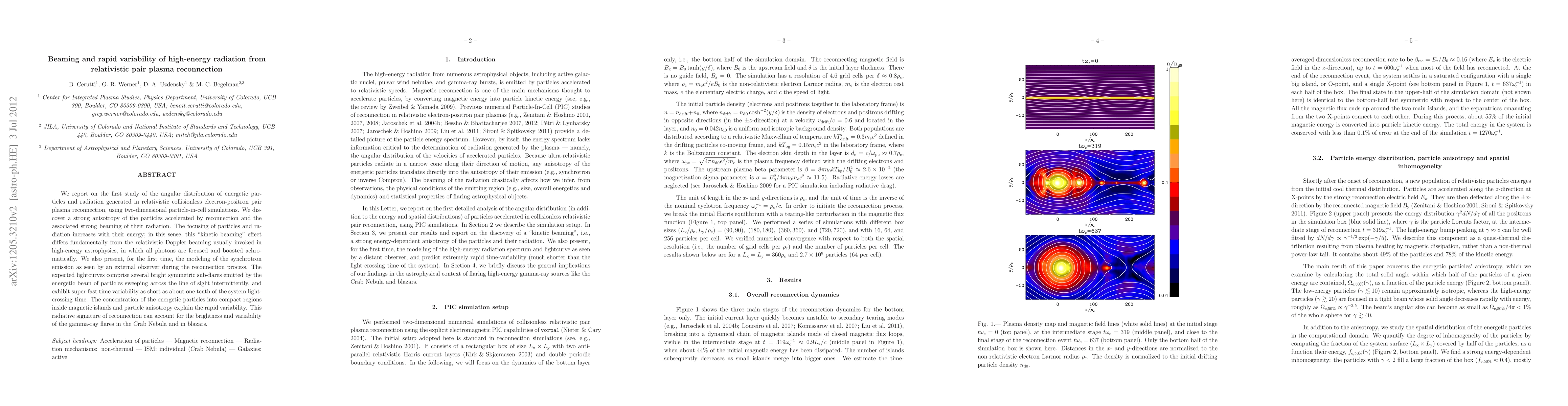 This paper reports on the first study of relativistic pair plasma reconnection, revealing strong anisotropy and beaming of accelerated particles and radiation, differing from traditional Doppler beaming. The simulations predict rapid variability in the reconnection's synchrotron emission, with bright sub-flares and time variability as short as one tenth of the system's light-crossing time, potentially explaining gamma-ray flares in astrophysical objects like the Crab Nebula and blazars.