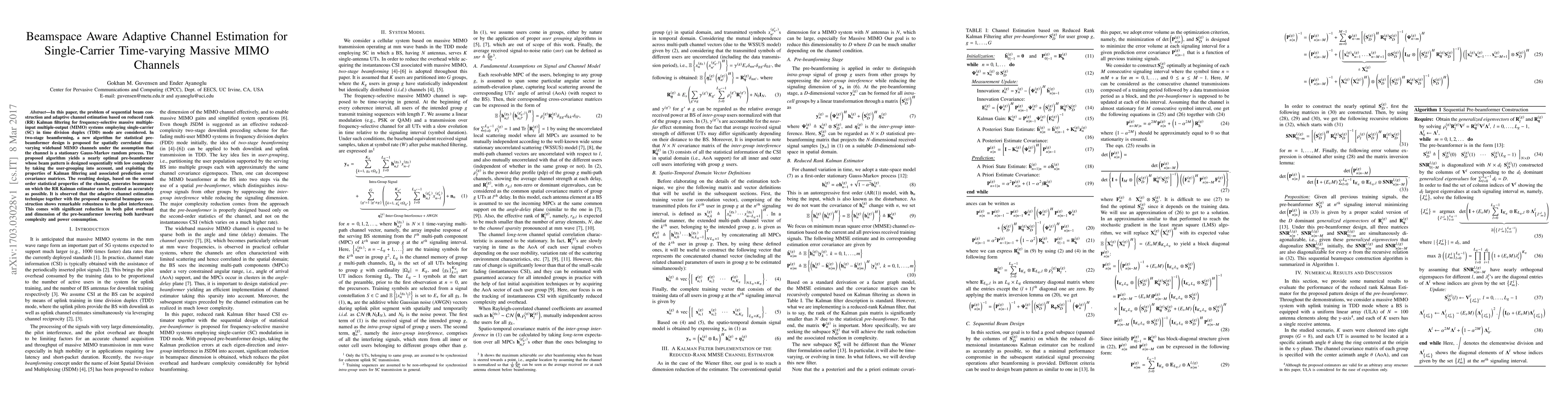 This paper proposes a new adaptive channel estimation method for time-varying massive MIMO systems using single-carrier in TDD mode, employing reduced rank Kalman filtering. The algorithm designs a nearly optimal pre-beamformer sequentially, reducing pilot overhead and complexity while maintaining robustness against pilot interference.