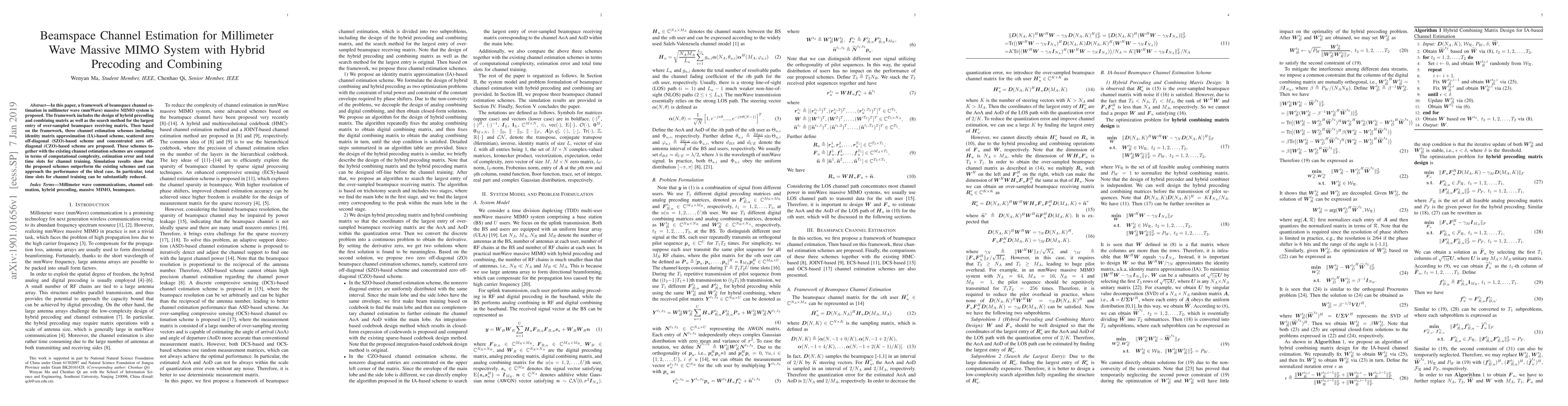 In this paper, a framework of beamspace channel estimation in millimeter wave (mmWave) massive MIMO system is proposed. The framework includes the design of hybrid precoding and combining matrix as well as the search method for the largest entry of over-sampled beamspace receiving matrix. Then based on the framework, three channel estimation schemes including identity matrix approximation (IA)-based scheme, scattered zero off-diagonal (SZO)-based scheme and concentrated zero off-diagonal (CZO)-based scheme are proposed. These schemes together with the existing channel estimation schemes are compared in terms of computational complexity, estimation error and total time slots for channel training. Simulation results show that the proposed schemes outperform the existing schemes and can approach the performance of the ideal case. In particular, total time slots for channel training can be substantially reduced.