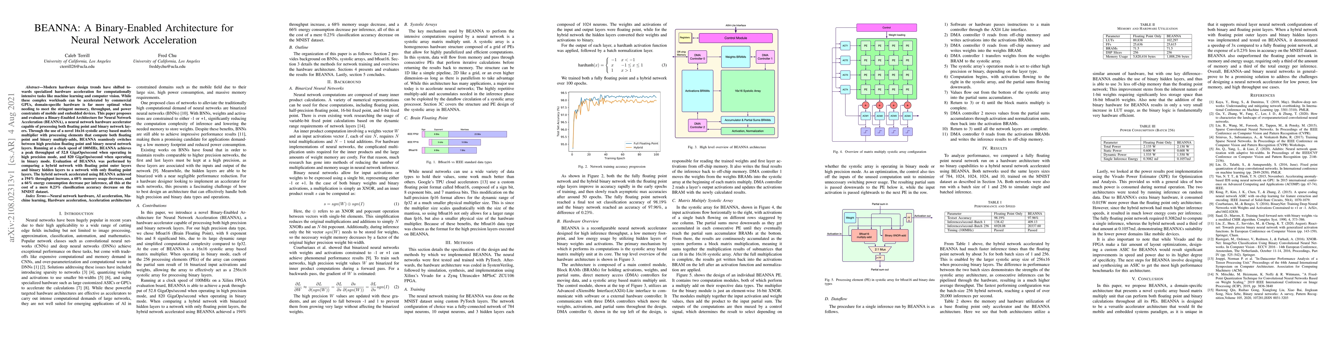 This paper introduces BEANNA, a specialized hardware accelerator for neural networks that efficiently processes both floating point and binary layers. BEANNA achieves high throughput and low power consumption, demonstrating a 194% increase in throughput and significant reductions in memory usage and energy consumption with a minimal loss in accuracy.