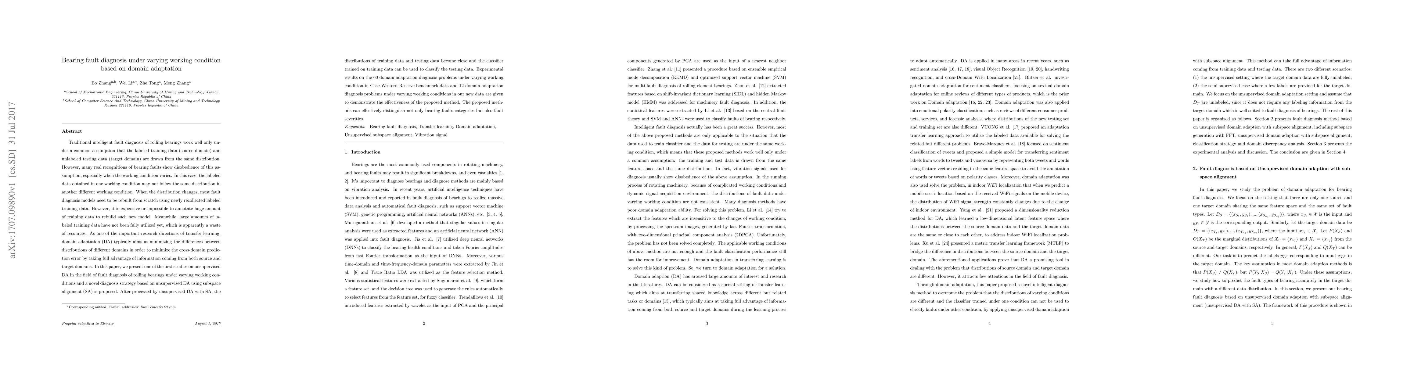 This paper proposes an unsupervised domain adaptation strategy using subspace alignment for fault diagnosis of rolling bearings under varying working conditions. The method aims to minimize distribution differences between source and target domains, enabling effective fault classification without the need for new labeled data, thus fully utilizing existing resources.