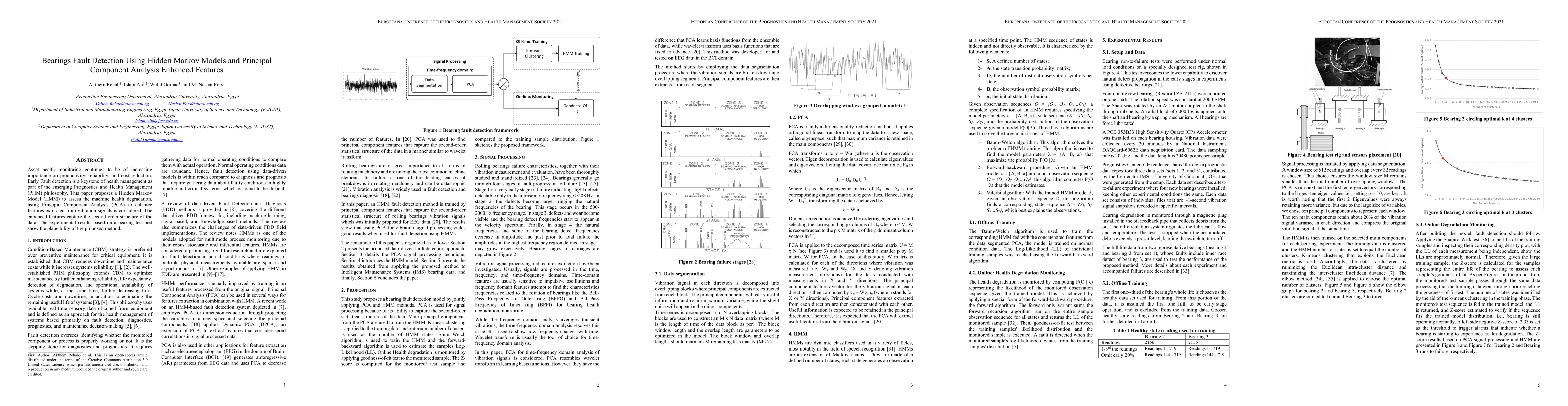 This research proposes a health monitoring framework for bearings using Hidden Markov Models (HMM) and Principal Component Analysis (PCA) for signal processing. Vibration signals are segmented, PCA is applied to extract features, and HMM is trained on these features for fault detection. The model is trained on normal condition data and tested on bearing run-to-failure experiments.