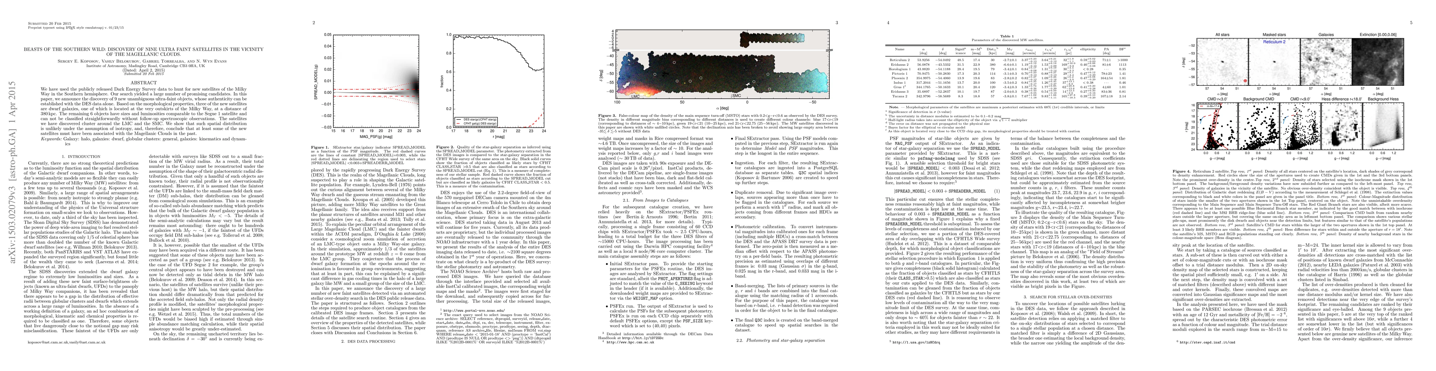 We have used the publicly released Dark Energy Survey data to hunt for new satellites of the Milky Way in the Southern hemisphere. Our search yielded a large number of promising candidates. In this paper, we announce the discovery of 9 new unambiguous ultra-faint objects, whose authenticity can be established with the DES data alone. Based on the morphological properties, three of the new satellites are dwarf galaxies, one of which is located at the very outskirts of the Milky Way, at a distance of 380 kpc. The remaining 6 objects have sizes and luminosities comparable to the Segue~1 satellite and can not be classified straightforwardly without follow-up spectroscopic observations. The satellites we have discovered cluster around the LMC and the SMC. We show that such spatial distribution is unlikely under the assumption of isotropy, and, therefore, conclude that at least some of the new satellites must have been associated with the Magellanic Clouds in the past.