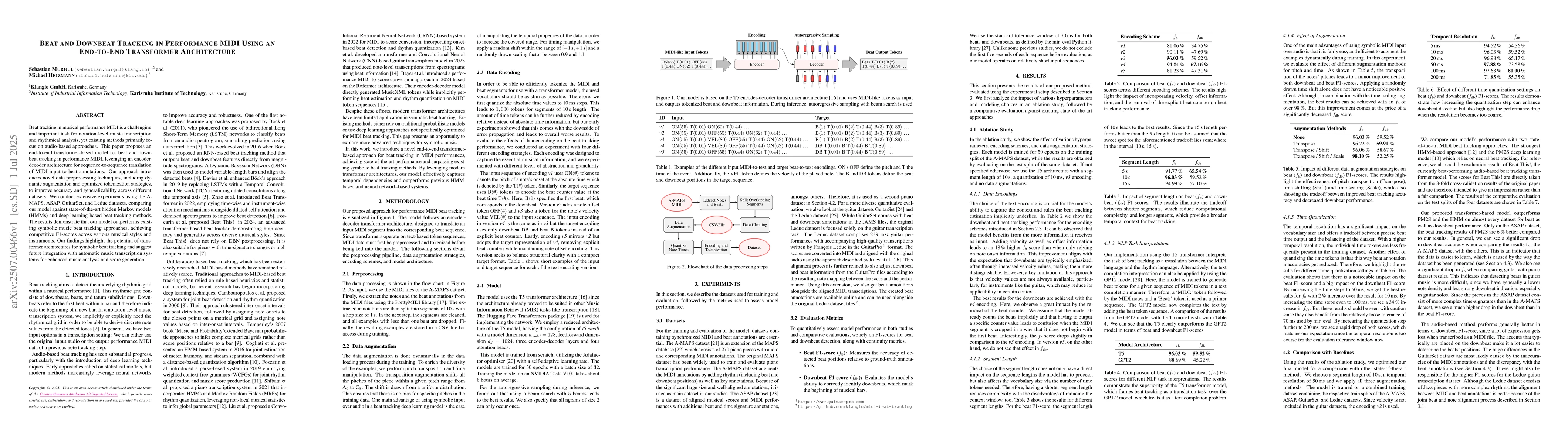 Beat tracking in musical performance MIDI is a challenging and important task for notation-level music transcription and rhythmical analysis, yet existing methods primarily focus on audio-based approaches. This paper proposes an end-to-end transformer-based model for beat and downbeat tracking in performance MIDI, leveraging an encoder-decoder architecture for sequence-to-sequence translation of MIDI input to beat annotations. Our approach introduces novel data preprocessing techniques, including dynamic augmentation and optimized tokenization strategies, to improve accuracy and generalizability across different datasets. We conduct extensive experiments using the A-MAPS, ASAP, GuitarSet, and Leduc datasets, comparing our model against state-of-the-art hidden Markov models (HMMs) and deep learning-based beat tracking methods. The results demonstrate that our model outperforms existing symbolic music beat tracking approaches, achieving competitive F1-scores across various musical styles and instruments. Our findings highlight the potential of transformer architectures for symbolic beat tracking and suggest future integration with automatic music transcription systems for enhanced music analysis and score generation.