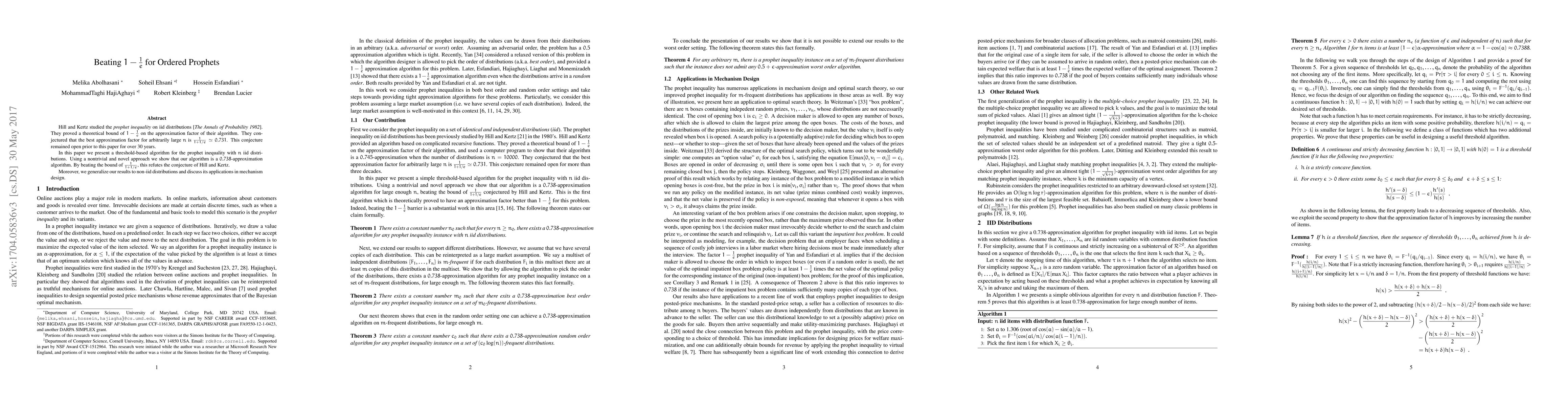 Hill and Kertz studied the prophet inequality on iid distributions [The Annals of Probability 1982]. They proved a theoretical bound of $1-\frac{1}{e}$ on the approximation factor of their algorithm. They conjectured that the best approximation factor for arbitrarily large n is $\frac{1}{1+1/e} \approx 0.731$. This conjecture remained open prior to this paper for over 30 years. In this paper we present a threshold-based algorithm for the prophet inequality with n iid distributions. Using a nontrivial and novel approach we show that our algorithm is a 0.738-approximation algorithm. By beating the bound of $\frac{1}{1+1/e}$, this refutes the conjecture of Hill and Kertz. Moreover, we generalize our results to non-iid distributions and discuss its applications in mechanism design.