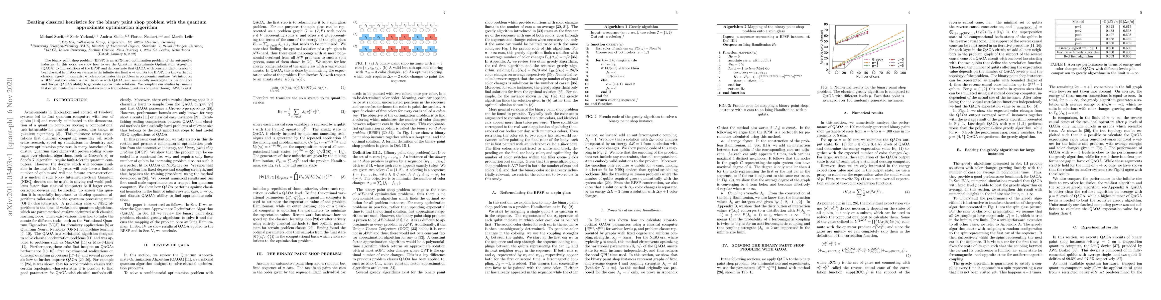 Researchers used Quantum Approximate Optimization Algorithm (QAOA) to solve the binary paint shop problem, a notoriously hard optimization problem, and found that QAOA outperforms classical heuristics in the infinite size limit.