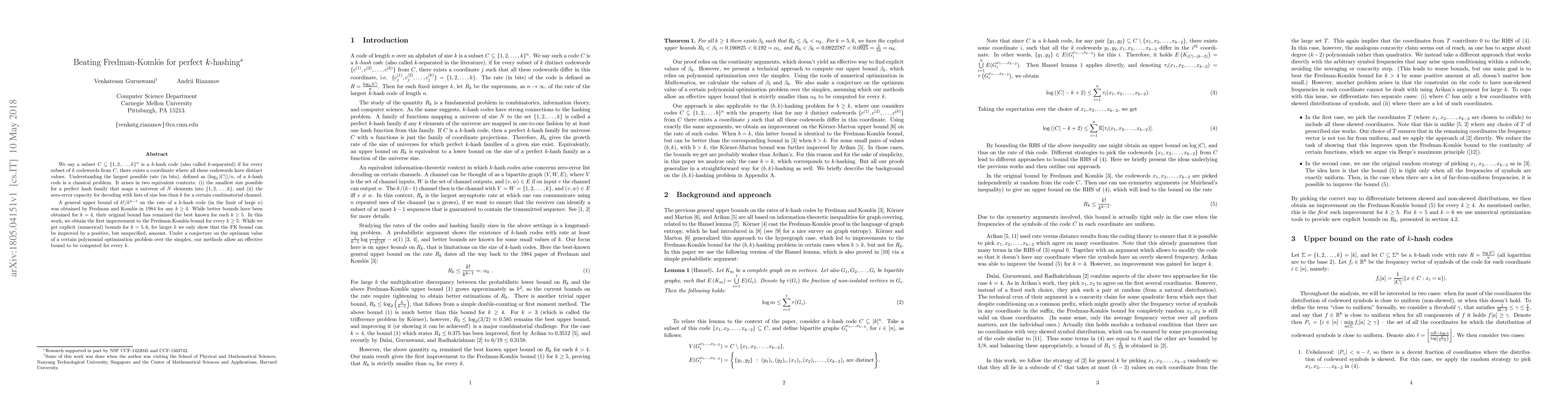 We say a subset $C \subseteq \{1,2,\dots,k\}^n$ is a $k$-hash code (also called $k$-separated) if for every subset of $k$ codewords from $C$, there exists a coordinate where all these codewords have distinct values. Understanding the largest possible rate (in bits), defined as $(\log_2 |C|)/n$, of a $k$-hash code is a classical problem. It arises in two equivalent contexts: (i) the smallest size possible for a perfect hash family that maps a universe of $N$ elements into $\{1,2,\dots,k\}$, and (ii) the zero-error capacity for decoding with lists of size less than $k$ for a certain combinatorial channel. A general upper bound of $k!/k^{k-1}$ on the rate of a $k$-hash code (in the limit of large $n$) was obtained by Fredman and Koml\'{o}s in 1984 for any $k \geq 4$. While better bounds have been obtained for $k=4$, their original bound has remained the best known for each $k \ge 5$. In this work, we obtain the first improvement to the Fredman-Koml\'{o}s bound for every $k \ge 5$. While we get explicit (numerical) bounds for $k=5,6$, for larger $k$ we only show that the FK bound can be improved by a positive, but unspecified, amount. Under a conjecture on the optimum value of a certain polynomial optimization problem over the simplex, our methods allow an effective bound to be computed for every $k$.