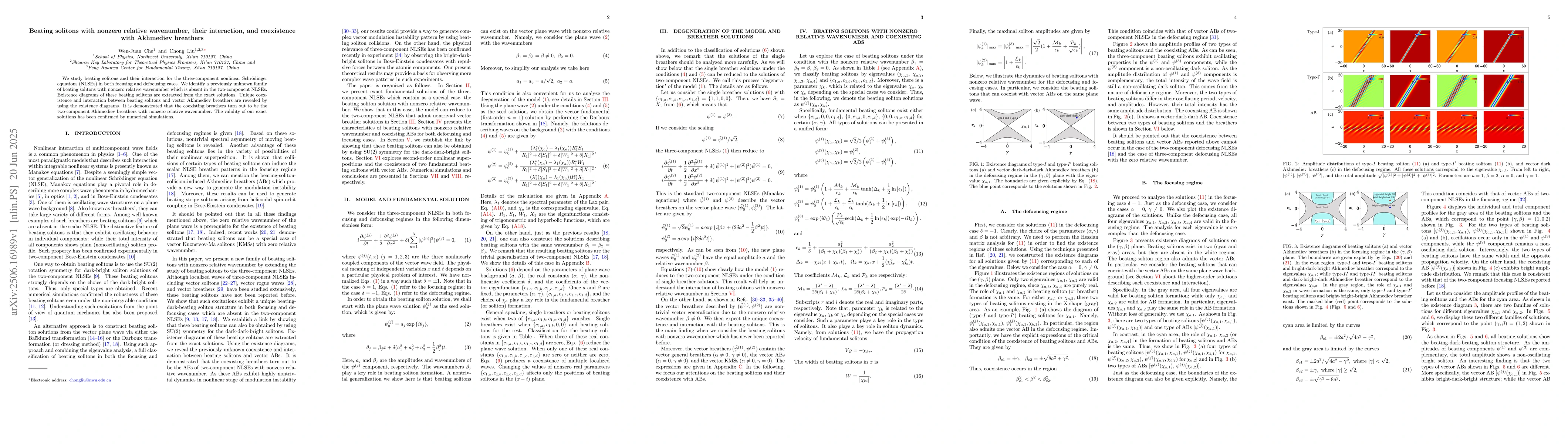We study beating solitons and their interaction for the three-component nonlinear Schr\"odinger equations (NLSEs) in both focusing and defocusing cases. We identify a previously unknown family of beating solitons with nonzero relative wavenumber which is absent in the two-component NLSEs. Existence diagrams of these beating solitons are extracted from the exact solutions. Unique coexistence and interaction between beating solitons and vector Akhmediev breathers are revealed by using the existence diagrams. It is demonstrated that the coexisting breathers turn out to be the two-component Akhmediev breathers with nonzero relative wavenumber. The validity of our exact solutions has been confirmed by numerical simulations.