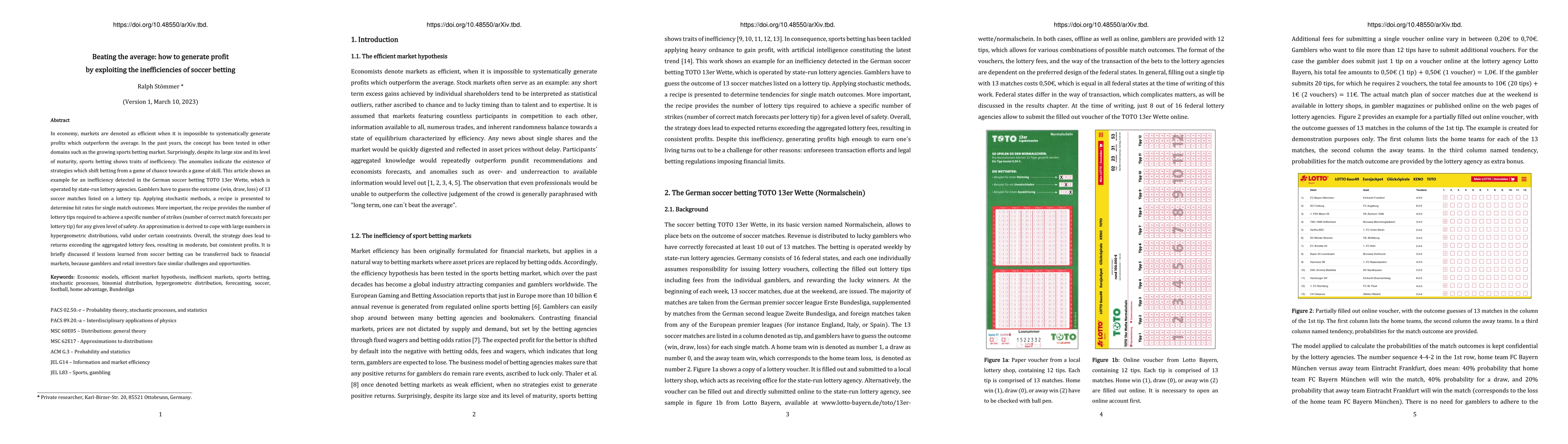 This paper explores inefficiencies in the German soccer betting market, specifically the TOTO 13er Wette, and proposes a strategy using stochastic methods to achieve higher hit rates and consistent profits. It discusses the potential transferability of these insights to financial markets due to shared challenges faced by gamblers and retail investors.