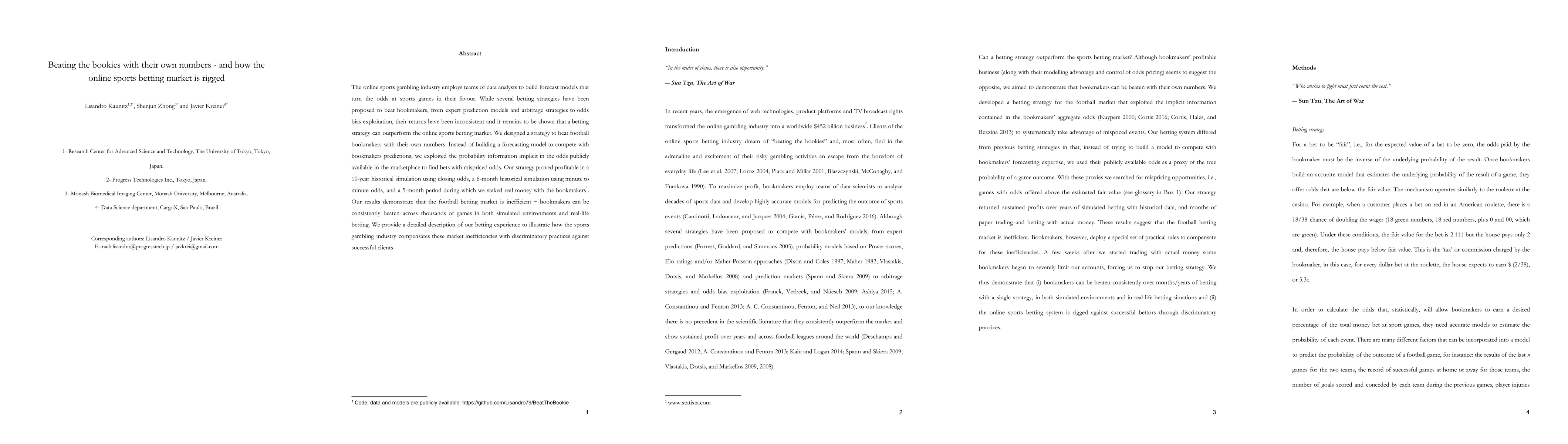 This paper details a strategy for consistently beating football bookmakers by exploiting mispriced odds in the online sports betting market, demonstrating profitability through historical simulations and real-money betting. The authors reveal the market's inefficiency and discuss how bookmakers counteract successful bettors with discriminatory practices.