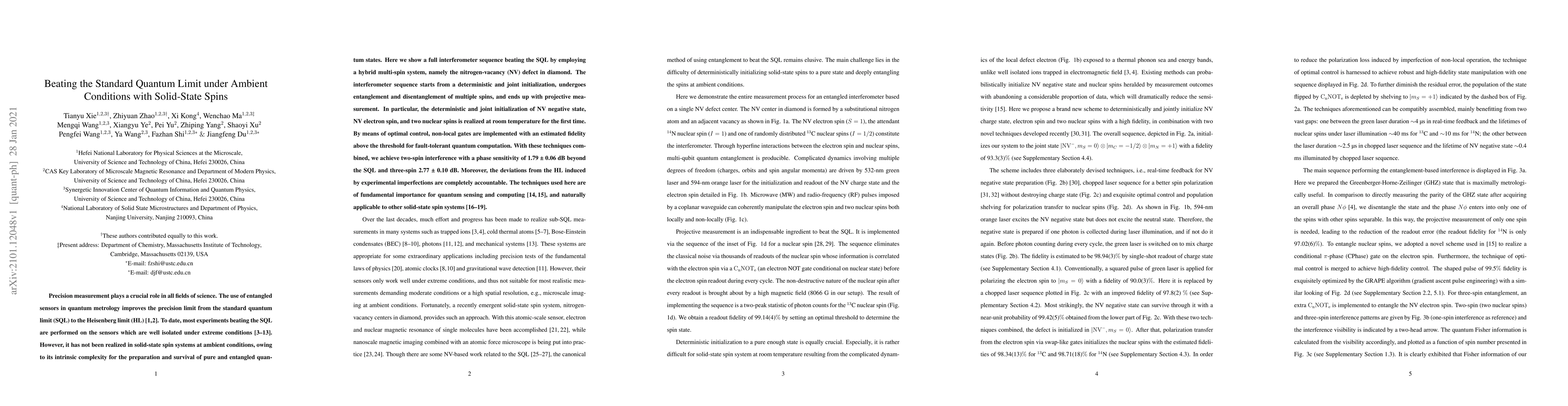 This paper demonstrates a hybrid multi-spin system using nitrogen-vacancy (NV) defects in diamond to achieve quantum metrology surpassing the standard quantum limit at ambient conditions, marking a significant advancement in solid-state spin systems. The study employs optimal control for non-local gates and deterministic initialization, achieving two-spin and three-spin interference beyond the standard quantum limit, with techniques applicable to broader quantum sensing and computing.