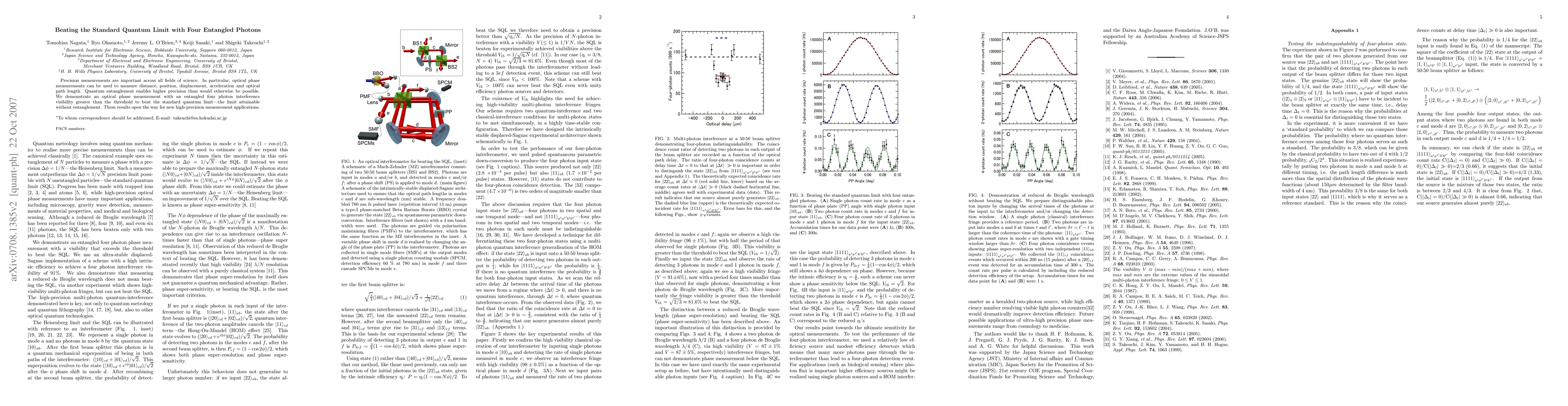 This paper demonstrates an optical phase measurement using four entangled photons, achieving an interference visibility that surpasses the standard quantum limit, thus enabling higher precision measurements for applications like distance and position determination. These findings pave the way for advanced high-precision measurement techniques.
