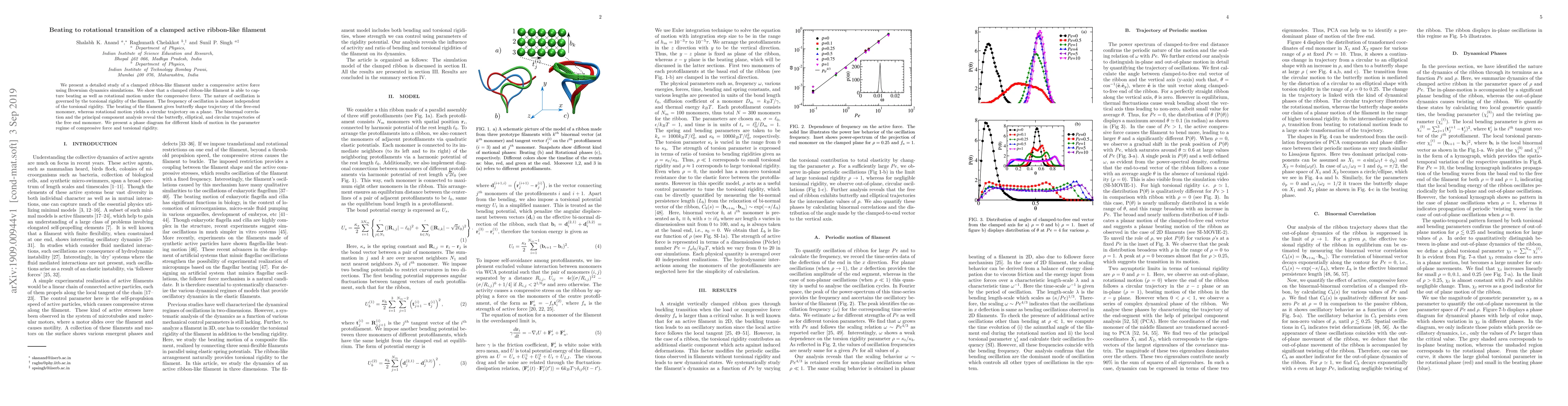 The paper presents a detailed analysis of a clamped active ribbon-like filament's beating to rotational transition using Brownian dynamics simulations, identifying key parameters governing the oscillation nature and frequency.