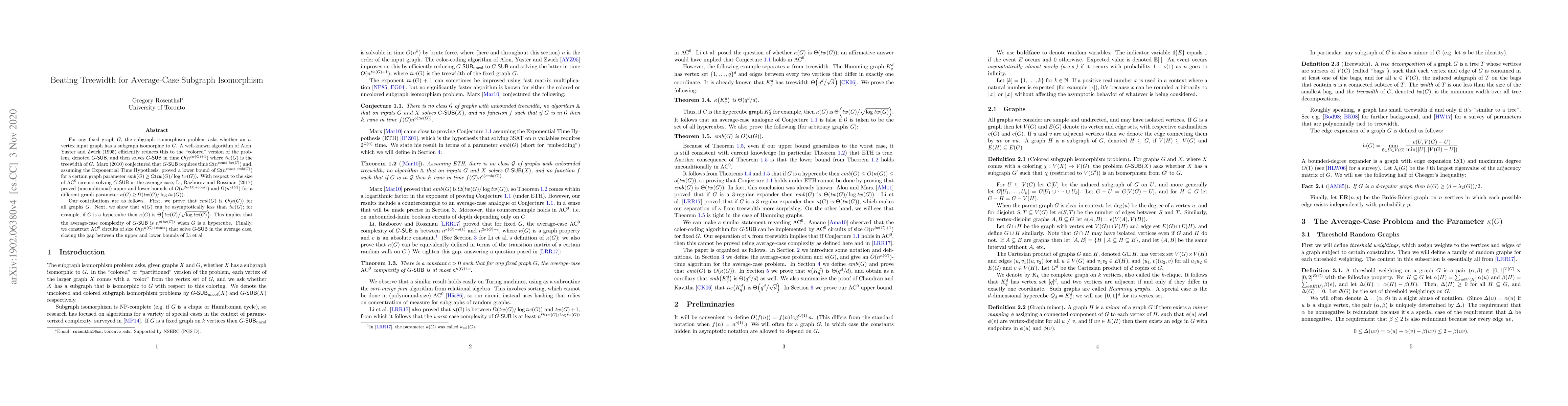 For any fixed graph $G$, the subgraph isomorphism problem asks whether an $n$-vertex input graph has a subgraph isomorphic to $G$. A well-known algorithm of Alon, Yuster and Zwick (1995) efficiently reduces this to the "colored" version of the problem, denoted $G$-$\mathsf{SUB}$, and then solves $G$-$\mathsf{SUB}$ in time $O(n^{tw(G)+1})$ where $tw(G)$ is the treewidth of $G$. Marx (2010) conjectured that $G$-$\mathsf{SUB}$ requires time $\Omega(n^{\mathrm{const}\cdot tw(G)})$ and, assuming the Exponential Time Hypothesis, proved a lower bound of $\Omega(n^{\mathrm{const}\cdot emb(G)})$ for a certain graph parameter $emb(G) \ge \Omega(tw(G)/\log tw(G))$. With respect to the size of $\mathrm{AC}^0$ circuits solving $G$-$\mathsf{SUB}$ in the average case, Li, Razborov and Rossman (2017) proved (unconditional) upper and lower bounds of $O(n^{2\kappa(G)+\mathrm{const}})$ and $\Omega(n^{\kappa(G)})$ for a different graph parameter $\kappa(G) \ge \Omega(tw(G)/\log tw(G))$. Our contributions are as follows. First, we prove that $emb(G)$ is $O(\kappa(G))$ for all graphs $G$. Next, we show that $\kappa(G)$ can be asymptotically less than $tw(G)$; for example, if $G$ is a hypercube then $\kappa(G)$ is $\Theta\big(tw(G)\big/\sqrt{\log tw(G)}\big)$. This implies that the average-case complexity of $G$-$\mathsf{SUB}$ is $n^{o(tw(G))}$ when $G$ is a hypercube. Finally, we construct $\mathrm{AC}^0$ circuits of size $O(n^{\kappa(G)+\mathrm{const}})$ that solve $G$-$\mathsf{SUB}$ in the average case, closing the gap between the upper and lower bounds of Li et al.