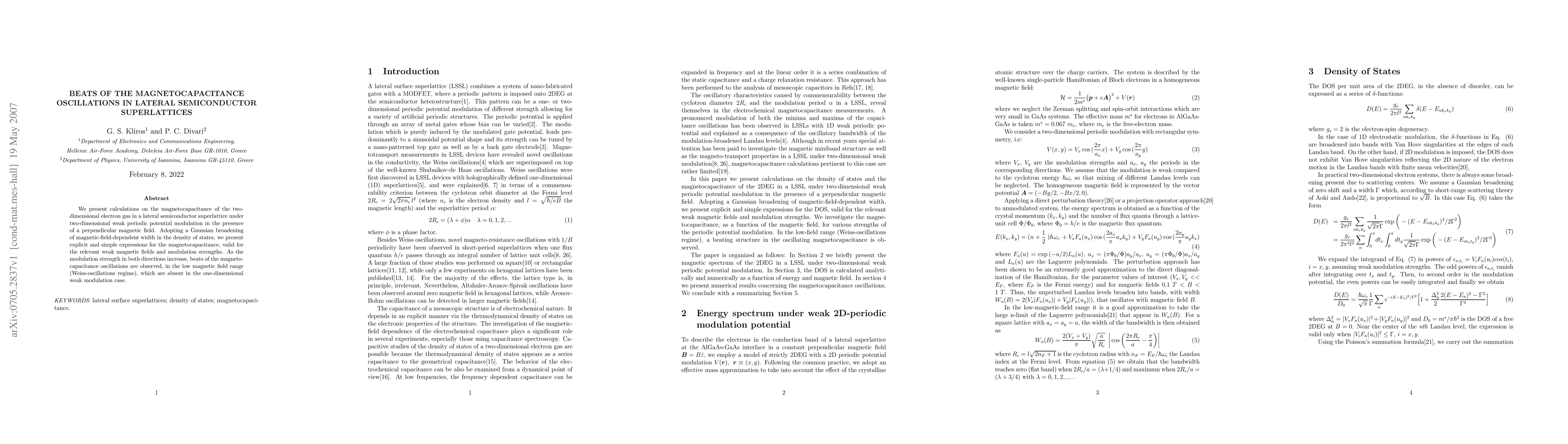 This paper calculates the magnetocapacitance in a two-dimensional electron gas within a lateral semiconductor superlattice under periodic modulation and a perpendicular magnetic field, presenting expressions valid for weak magnetic fields. It observes beat patterns in magnetocapacitance oscillations as modulation strength increases, a phenomenon not present in one-dimensional modulation.