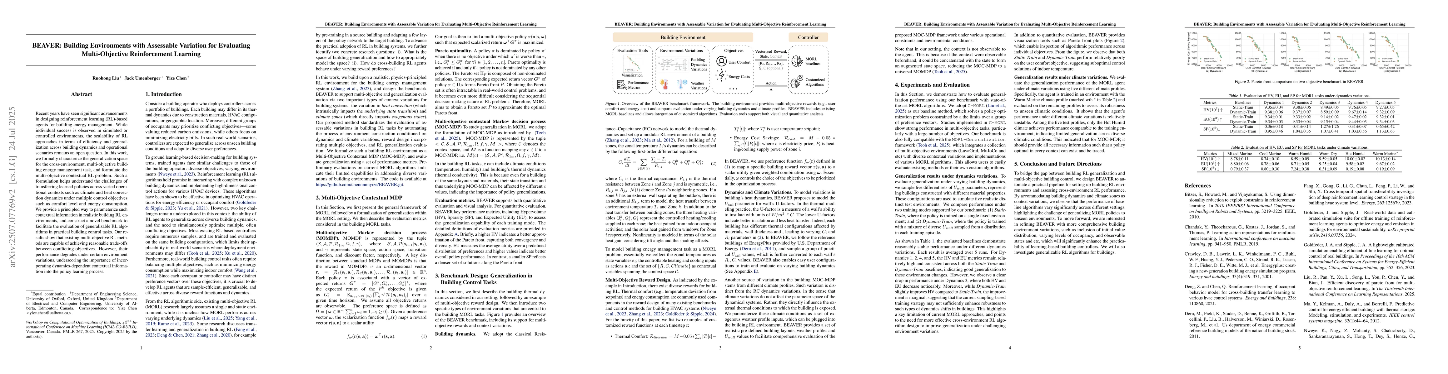 Recent years have seen significant advancements in designing reinforcement learning (RL)-based agents for building energy management. While individual success is observed in simulated or controlled environments, the scalability of RL approaches in terms of efficiency and generalization across building dynamics and operational scenarios remains an open question. In this work, we formally characterize the generalization space for the cross-environment, multi-objective building energy management task, and formulate the multi-objective contextual RL problem. Such a formulation helps understand the challenges of transferring learned policies across varied operational contexts such as climate and heat convection dynamics under multiple control objectives such as comfort level and energy consumption. We provide a principled way to parameterize such contextual information in realistic building RL environments, and construct a novel benchmark to facilitate the evaluation of generalizable RL algorithms in practical building control tasks. Our results show that existing multi-objective RL methods are capable of achieving reasonable trade-offs between conflicting objectives. However, their performance degrades under certain environment variations, underscoring the importance of incorporating dynamics-dependent contextual information into the policy learning process.