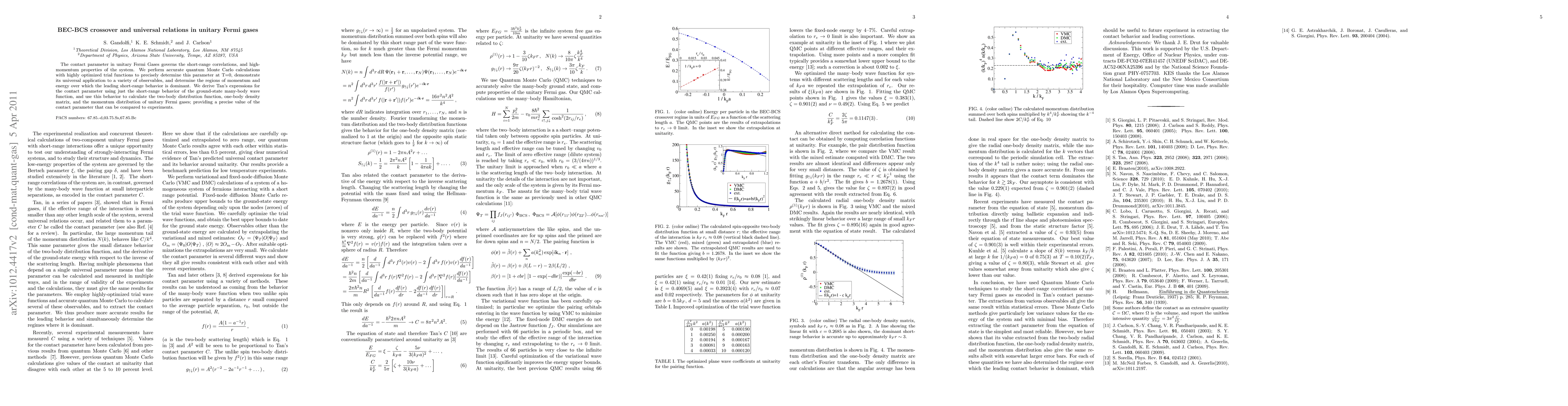 This paper uses quantum Monte Carlo calculations to determine the contact parameter in unitary Fermi gases, demonstrating its universal applicability across various observables and deriving Tan's expressions for this parameter. The study provides a precise value for the contact parameter, which can be compared to experimental results.