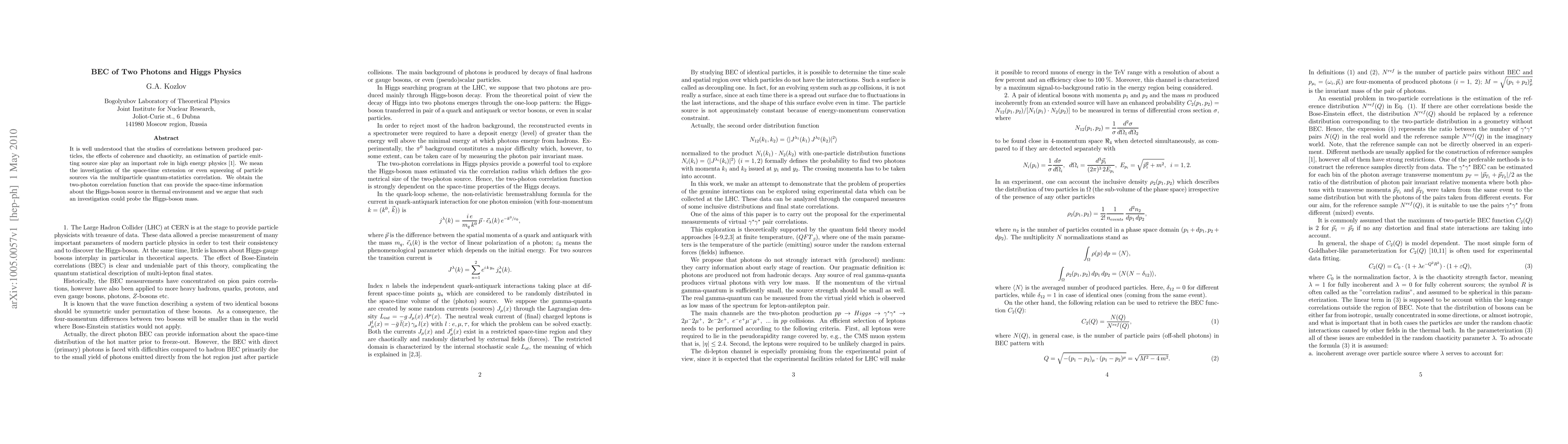 It is well understood that the studies of correlations between produced particles, the effects of coherence and chaoticity, an estimation of particle emitting source size play an important role in high energy physics [1]. We mean the investigation of the space-time extension or even squeezing of particle sources via the multiparticle quantum-statistics correlation. We obtain the two-photon correlation function that can provide the space-time information about the Higgs-boson source in thermal environment and we argue that such an investigation could probe the Higgs-boson mass.