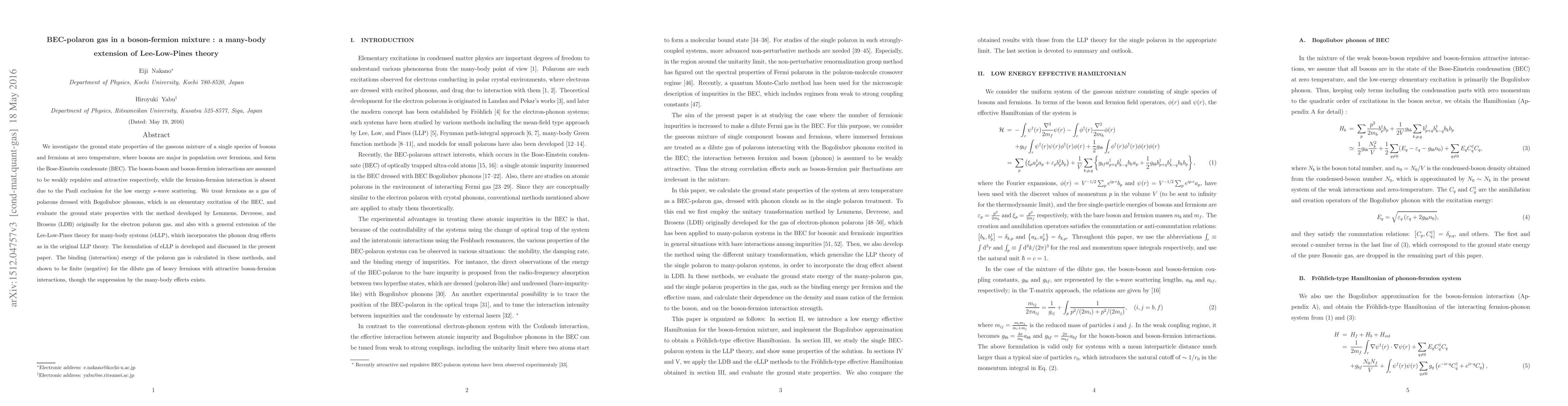 We investigate the ground state properties of the gaseous mixture of a single species of bosons and fermions at zero temperature, where bosons are major in population over fermions, and form the Bose-Einstein condensate (BEC). The boson-boson and boson-fermion interactions are assumed to be weakly repulsive and attractive respectively, while the fermion-fermion interaction is absent due to the Pauli exclusion for the low energy $s$-wave scattering. We treat fermions as a gas of polarons dressed with Bogoliubov phonons, which is an elementary excitation of the BEC, and evaluate the ground state properties with the method developed by Lemmens, Devreese, and Brosens (LDB) originally for the electron polaron gas, and also with a general extension of the Lee-Low-Pines theory for many-body systems (eLLP), which incorporates the phonon drag effects as in the original LLP theory. The formulation of eLLP is developed and discussed in the present paper. The binding (interaction) energy of the polaron gas is calculated in these methods, and shown to be finite (negative) for the dilute gas of heavy fermions with attractive boson-fermion interactions, though the suppression by the many-body effects exists.
