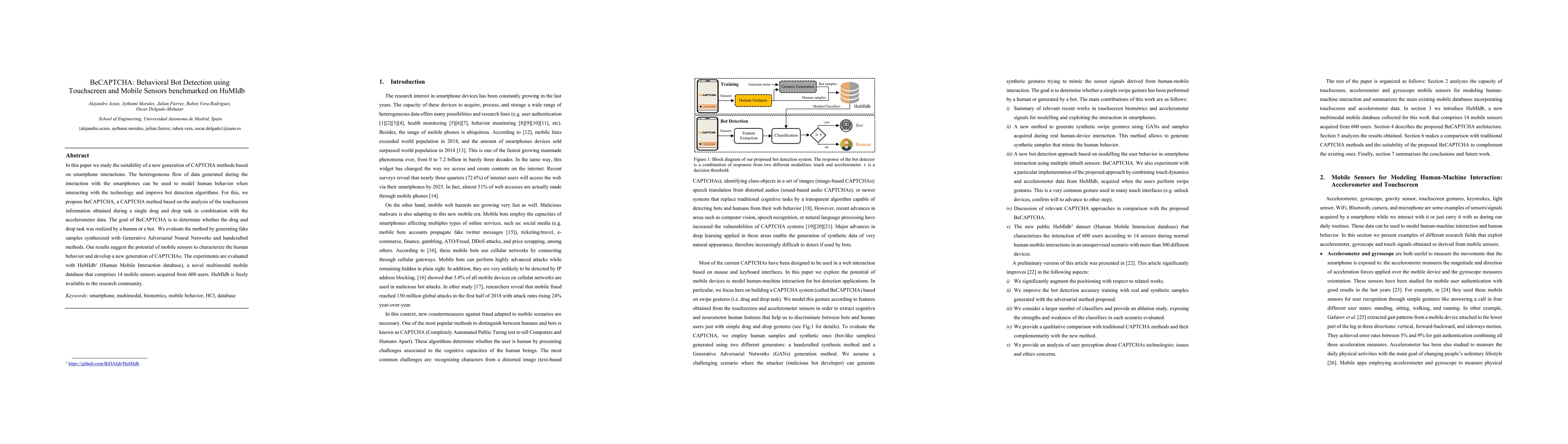 BeCAPTCHA leverages touchscreen and mobile sensor data to detect bots through human-like interaction patterns, evaluated using the HuMIdb dataset. The method shows promise in characterizing human behavior for advanced CAPTCHA systems.