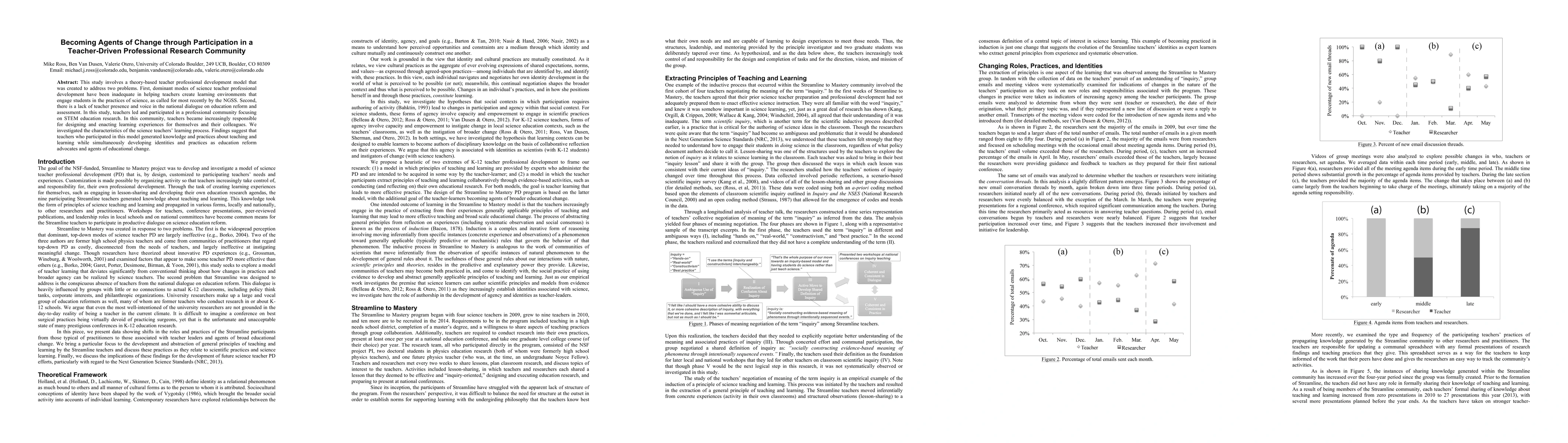 This study explores a teacher-driven professional development model aimed at enhancing science teaching practices and increasing teacher influence in education reform. Teachers engaged in a community-based research initiative, leading to their development as education reform advocates and agents of change.