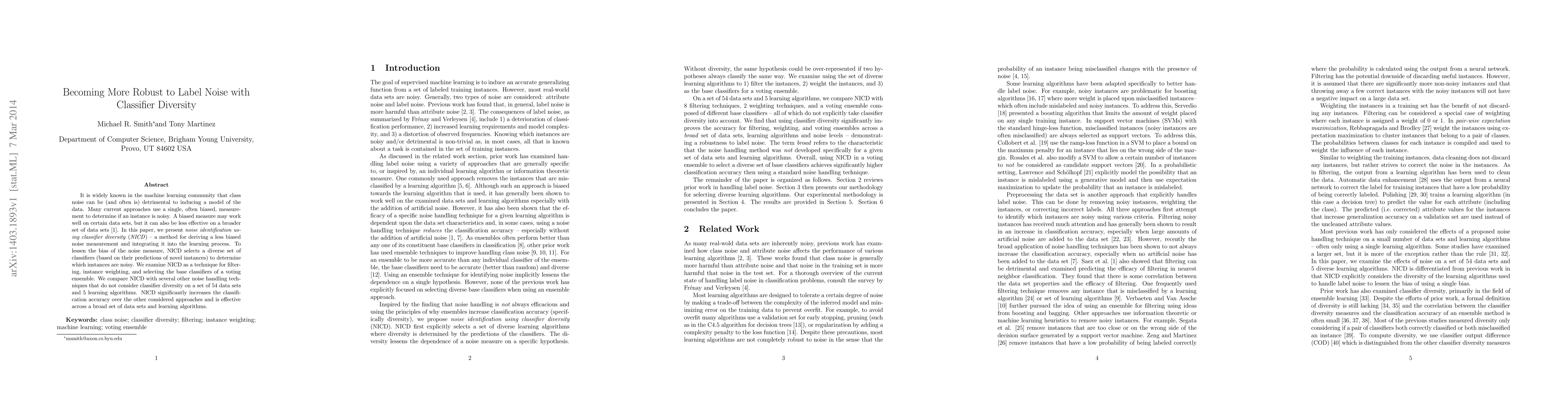 A new method called Noise Identification using Classifier Diversity (NICD) uses a diverse set of classifiers to identify noisy instances, significantly improving classification accuracy over other noise handling techniques on a broad range of data sets and algorithms.