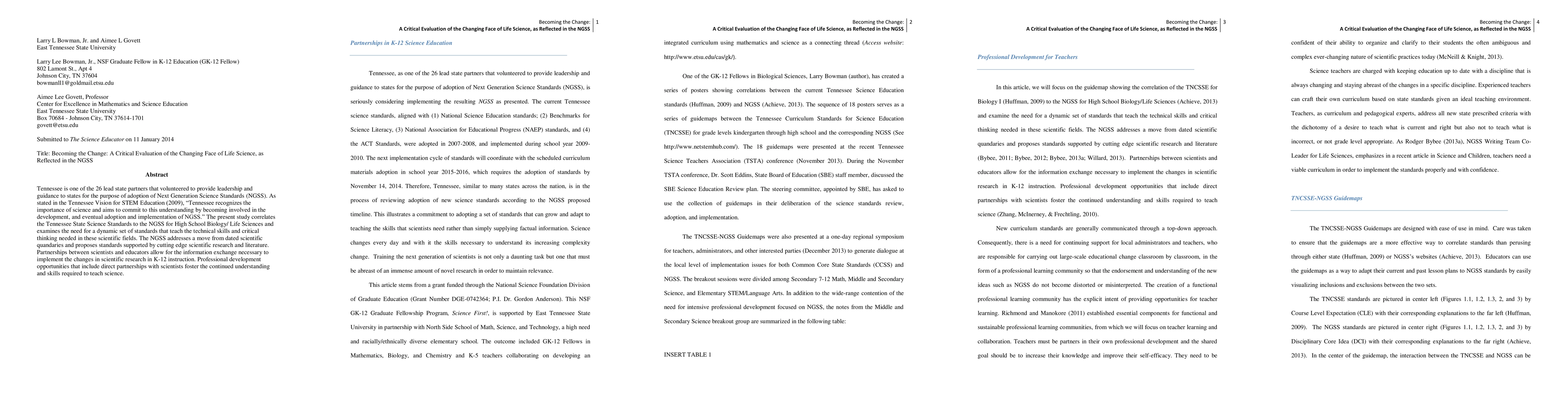 This study evaluates Tennessee's role in adopting the Next Generation Science Standards (NGSS) and correlates them with the state's high school biology standards. It emphasizes the need for updated scientific education to incorporate cutting-edge research and critical thinking skills, facilitated by partnerships between scientists and educators.