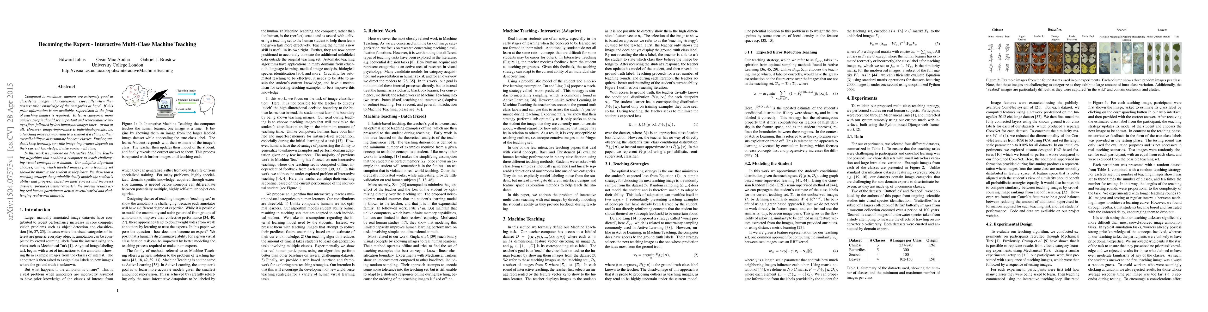 Compared to machines, humans are extremely good at classifying images into categories, especially when they possess prior knowledge of the categories at hand. If this prior information is not available, supervision in the form of teaching images is required. To learn categories more quickly, people should see important and representative images first, followed by less important images later - or not at all. However, image-importance is individual-specific, i.e. a teaching image is important to a student if it changes their overall ability to discriminate between classes. Further, students keep learning, so while image-importance depends on their current knowledge, it also varies with time. In this work we propose an Interactive Machine Teaching algorithm that enables a computer to teach challenging visual concepts to a human. Our adaptive algorithm chooses, online, which labeled images from a teaching set should be shown to the student as they learn. We show that a teaching strategy that probabilistically models the student's ability and progress, based on their correct and incorrect answers, produces better 'experts'. We present results using real human participants across several varied and challenging real-world datasets.