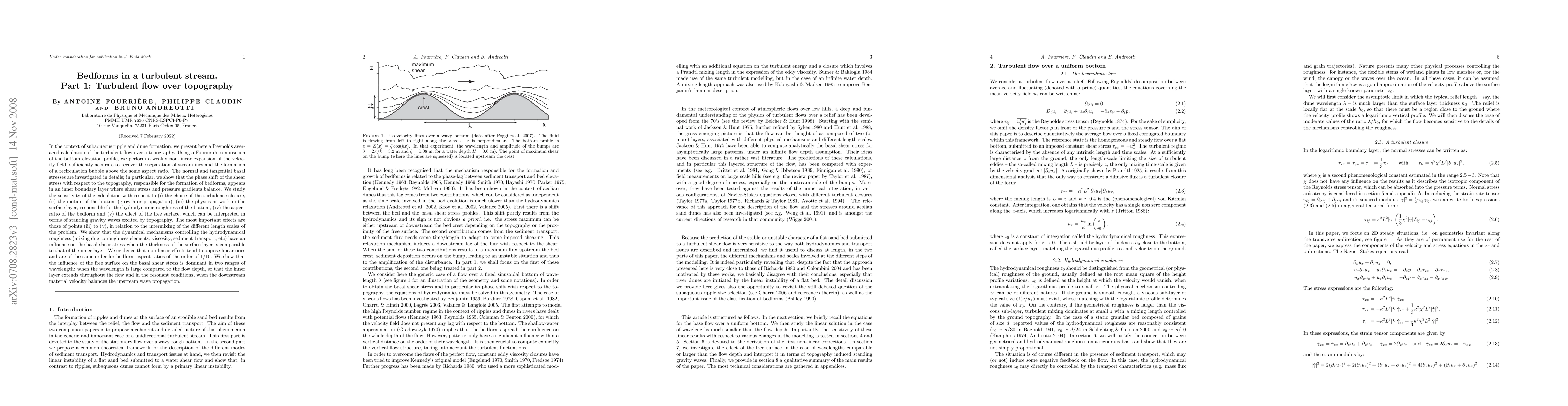 In the context of subaqueous ripple and dune formation, we present here a Reynolds averaged calculation of the turbulent flow over a topography. We perform a weakly non-linear expansion of the velocity field, sufficiently accurate to recover the separation of streamlines and the formation of a recirculation bubble above some aspect ratio. The basal stresses are investigated in details; in particular, we show that the phase shift of the shear stress with respect to the topography, responsible for the formation of bedforms, appears in an inner boundary layer where shear stress and pressure gradients balance. We study the sensitivity of the calculation with respect to (i) the choice of the turbulence closure, (ii) the motion of the bottom (growth or propagation), (iii) the physics at work in the surface layer, responsible for the hydrodynamic roughness of the bottom, (iv) the aspect ratio of the bedform and (v) the effect of the free surface, which can be interpreted in terms of standing gravity waves excited by topography. The most important effects are those of points (iii) to (v). We show that the dynamical mechanisms controlling the hydrodynamical roughness (mixing due to roughness elements, viscosity, sediment transport, etc) have an influence on the basal shear stress when the thickness of the surface layer is comparable to that of the inner layer. We evidence that non-linear effects tend to oppose linear ones and are of the same order for bedform aspect ratios of the order of 1/10. We show that the influence of the free surface on the basal shear stress is dominant when the wavelength is large compared to the flow depth, so that the inner layer extends throughout the flow and in the resonant conditions, and when the downstream material velocity balances the upstream wave propagation.