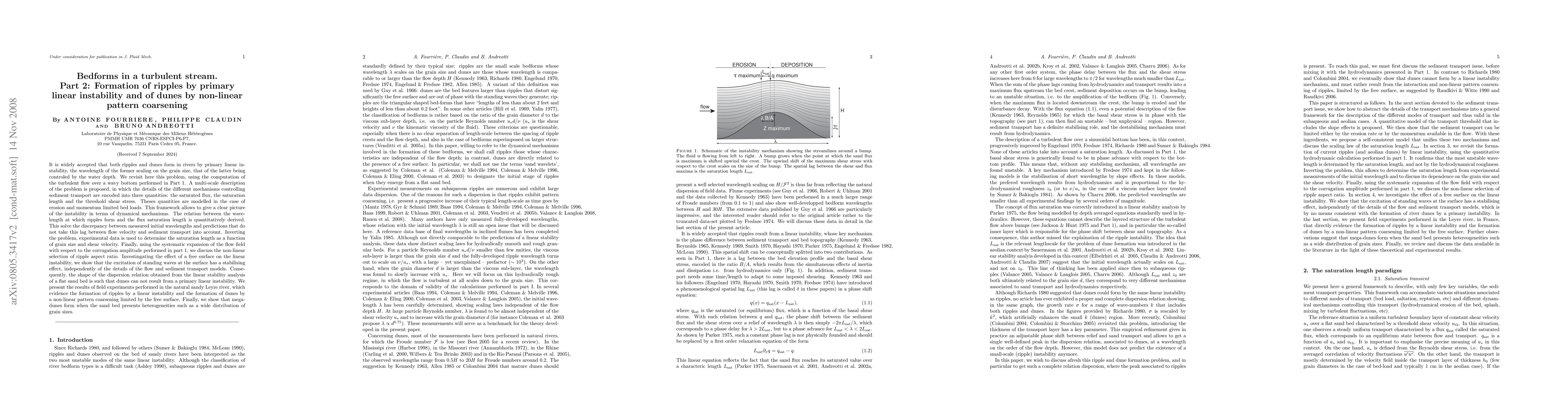 It is widely accepted that both ripples and dunes form in rivers by primary linear instability, the wavelength of the former scaling on the grain size, that of the latter being controled by the water depth. We revisit here this problem, using the computation of the turbulent flow over a wavy bottom performed in Part 1. The details of the different mechanisms controlling sediment transport are encoded into three quantities: the saturated flux, the saturation length and the threshold shear stress. Theses quantities are modelled in the case of erosion and momentum limited bed loads. This framework allows to give a clear picture of the instability in terms of dynamical mechanisms. The relation between the wavelength at which ripples form and the flux saturation length is quantitatively derived. Inverting the problem, experimental data is used to determine the saturation length as a function of grain size and shear velocity. Finally, using the systematic expansion of the flow field with respect to the corrugation amplitude, we discuss the non-linear selection of ripple aspect ratio. Investingating the effect of a free surface on the linear instability, we show that the excitation of standing waves at the surface has a stabilising effect, independently of the details of the flow and sediment transport models. Consequently, the shape of the dispersion relation is such that dunes can not result from a primary linear instability. We present the results of field experiments performed in the natural sandy Leyre river, which evidence the formation of ripples by a linear instability and the formation of dunes by a non-linear pattern coarsening limited by the free surface. We show that mega-dunes form when the sand bed presents heterogeneities such as a wide distribution of grain sizes.