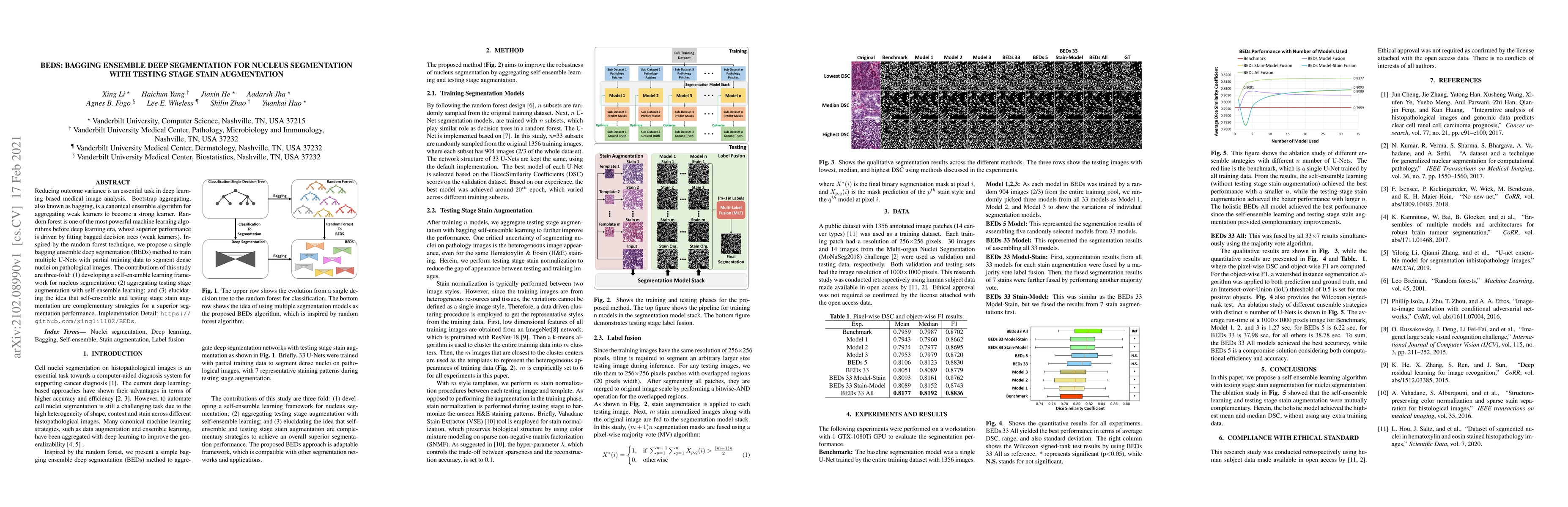 Reducing outcome variance is an essential task in deep learning based medical image analysis. Bootstrap aggregating, also known as bagging, is a canonical ensemble algorithm for aggregating weak learners to become a strong learner. Random forest is one of the most powerful machine learning algorithms before deep learning era, whose superior performance is driven by fitting bagged decision trees (weak learners). Inspired by the random forest technique, we propose a simple bagging ensemble deep segmentation (BEDs) method to train multiple U-Nets with partial training data to segment dense nuclei on pathological images. The contributions of this study are three-fold: (1) developing a self-ensemble learning framework for nucleus segmentation; (2) aggregating testing stage augmentation with self-ensemble learning; and (3) elucidating the idea that self-ensemble and testing stage stain augmentation are complementary strategies for a superior segmentation performance. Implementation Detail: https://github.com/xingli1102/BEDs.