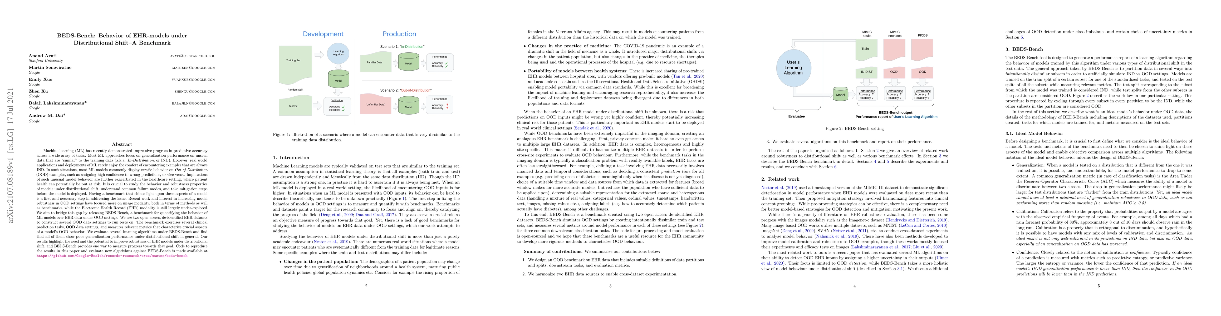 The paper introduces BEDS-Bench, a benchmark for evaluating machine learning models' behavior on Electronic Health Record (EHR) data under distributional shifts. Testing various learning algorithms, the research finds all models generally struggle with OOD generalization, underscoring the necessity for improving EHR model robustness in such settings.
