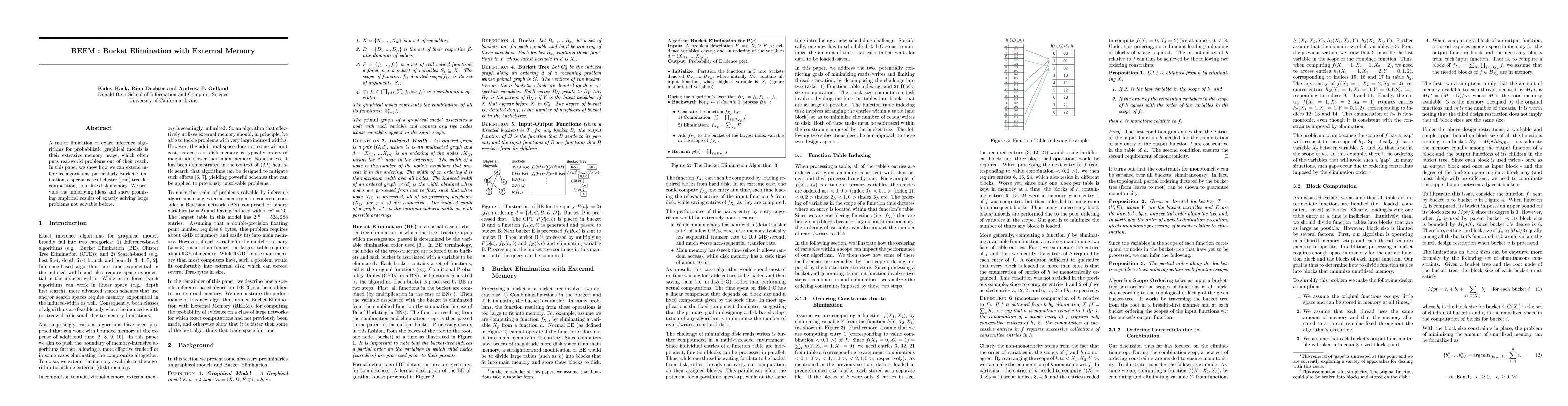 A major limitation of exact inference algorithms for probabilistic graphical models is their extensive memory usage, which often puts real-world problems out of their reach. In this paper we show how we can extend inference algorithms, particularly Bucket Elimination, a special case of cluster (join) tree decomposition, to utilize disk memory. We provide the underlying ideas and show promising empirical results of exactly solving large problems not solvable before.