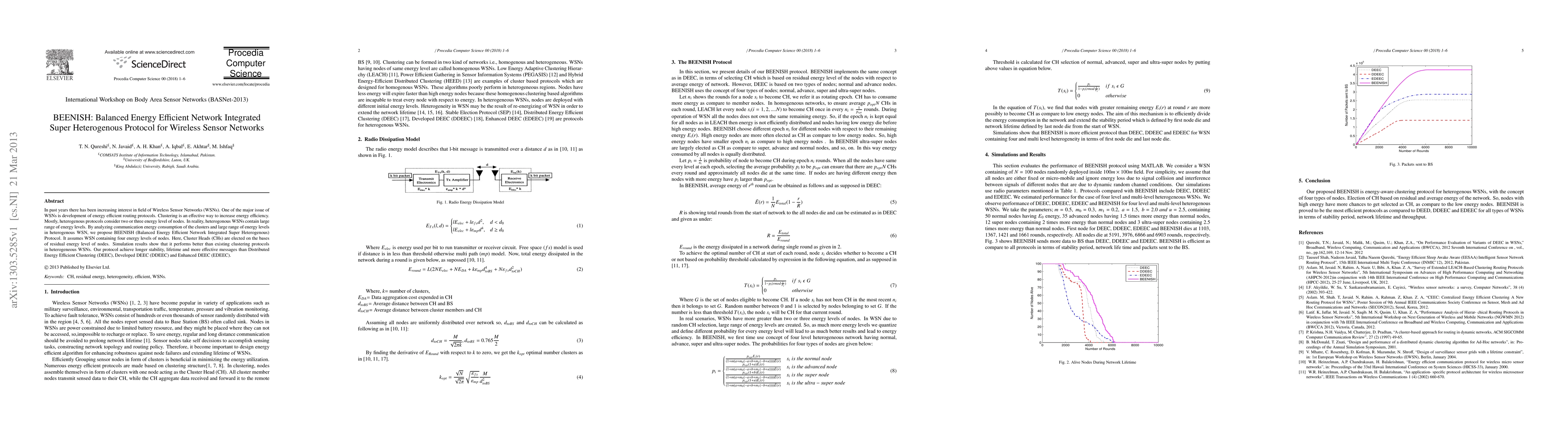 Summary: BEENISH Protocol proposes a balanced, energy-efficient clustering method for heterogeneous Wireless Sensor Networks (WSNs) that considers four energy levels of nodes, leading to better stability, network lifetime, and message efficiency compared to existing protocols like DEEC, DDEEC, and EDEEC.