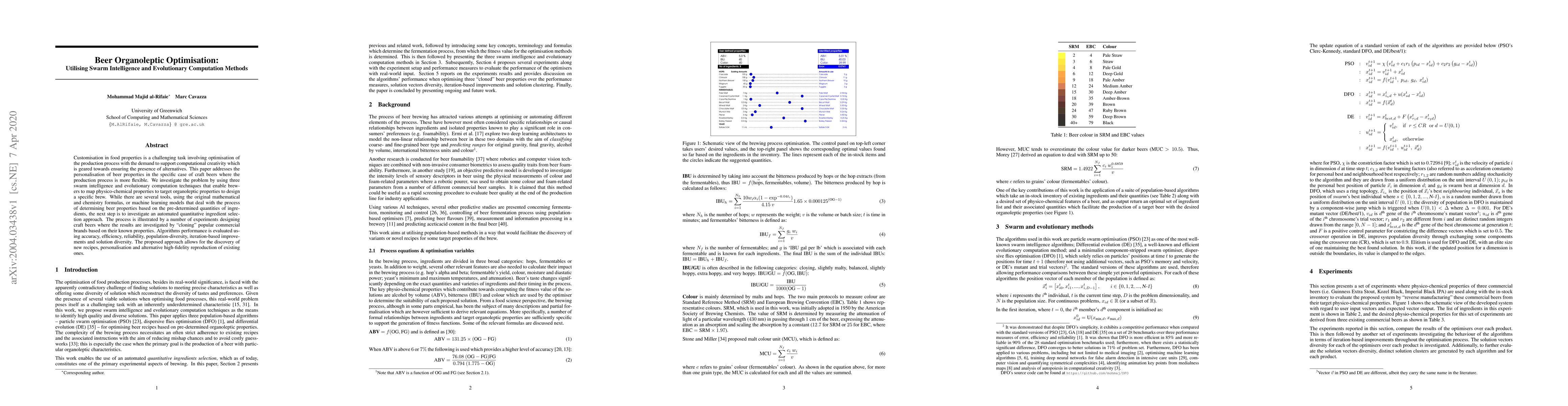 This paper explores the optimisation of craft beer properties using swarm intelligence and evolutionary computation methods to automate the selection of ingredients. The study evaluates the performance of various algorithms in designing new brews and replicating existing commercial brands, focusing on accuracy, efficiency, and diversity.