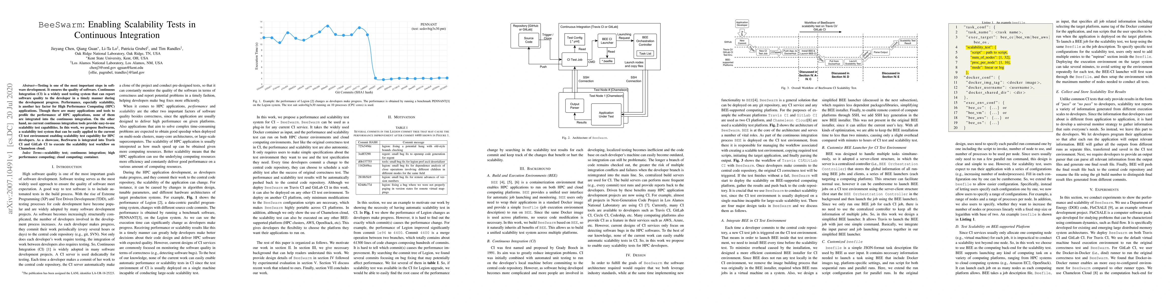 BeeSwarm is a proposed scalability test system integrated into continuous integration (CI) environments to enhance the testing of High Performance Computing (HPC) applications. It aims to provide easy-to-use scalability test capabilities within existing CI tools like Travis CI and GitLab CI.
