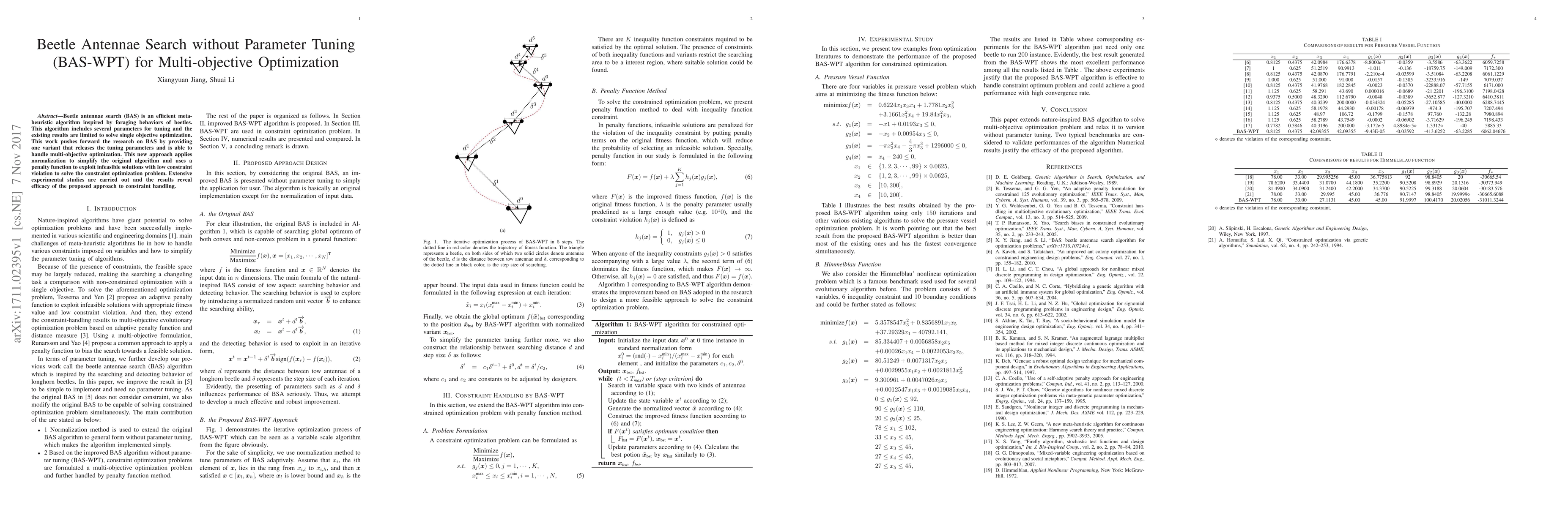 The Beetle Antennae Search without Parameter Tuning (BAS-WPT) algorithm simplifies the original BAS by eliminating the need for parameter tuning and extends its capability to multi-objective optimization through normalization and a penalty function for constraint handling, demonstrating effectiveness in experimental studies.