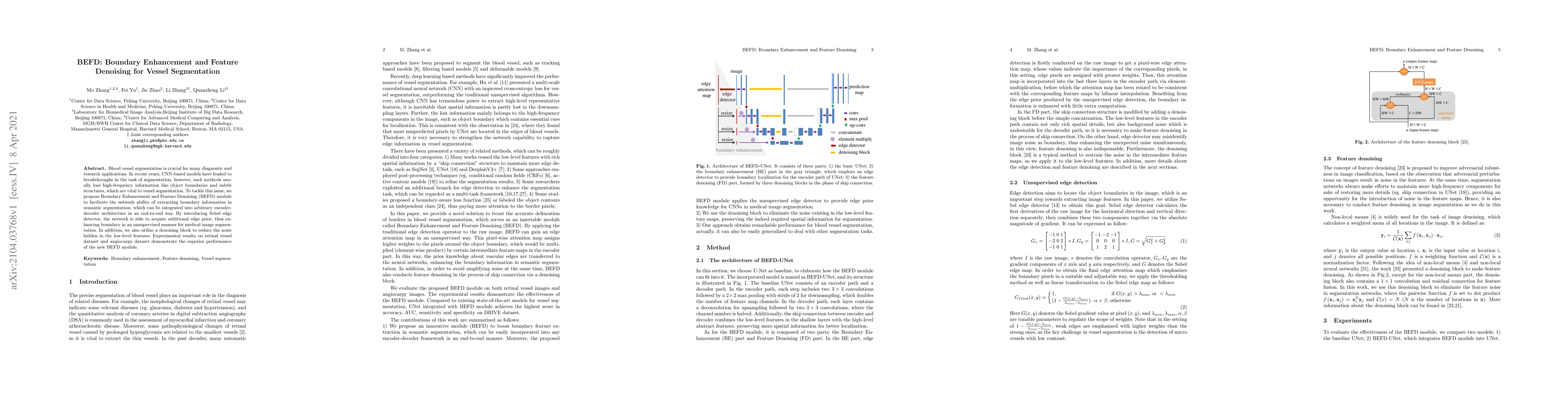 A new module called Boundary Enhancement and Feature Denoising (BEFD) improves blood vessel segmentation by enhancing boundary information and reducing noise in medical images, leading to superior performance on retinal vessel and angiocarpy datasets.