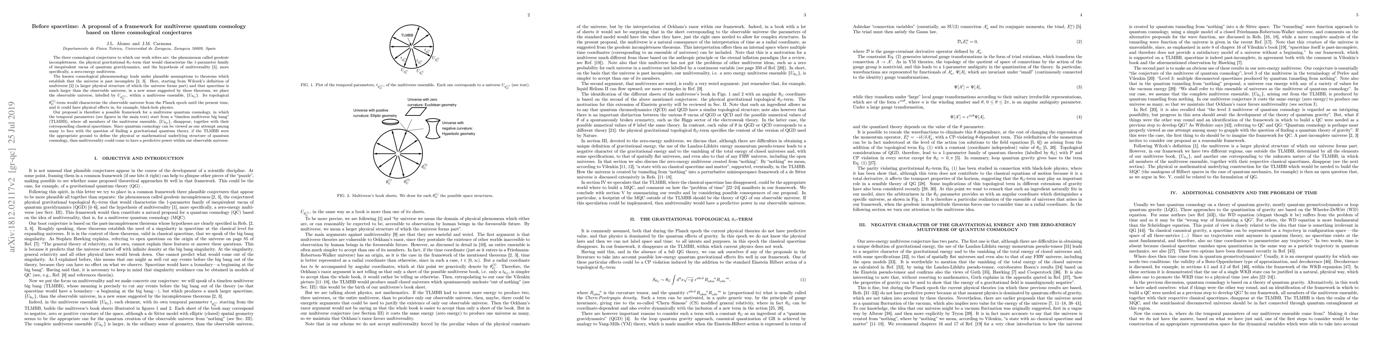 The three cosmological conjectures to which our work refers are: the phenomenon called geodesic incompleteness, the physical gravitational $\theta_G$-term that would characterize the 1-parameter family of inequivalent vacua of quantum gravidynamics, and the hypothesis of multiversality, more specifically, a zero-energy multiverse. The known cosmological phenomenology leads under plausible assumptions to theorems which establish that the universe is past incomplete. Here, starting from Wilczek's definition of multiverse (a larger physical structure of which the universe forms part) and that spacetime is much larger than the observable universe, in a new sense suggested by these theorems, we place the observable universe, labelled by $U_{\theta_G^{(1)}}$, within a multiverse ensemble, $\{U_{\theta_G}\}$. Its topological $\theta_G^{(1)}$-term would characterize the observable universe from the Planck epoch until the present time, and it could have physical effects in, for example, black-hole physics. Our proposal is therefore a possible framework for a multiverse quantum cosmology, in which the temporal parameters (see figures in the main text) start from a "timeless multiverse big bang" (TLMBB), where all members of the multiverse ensemble, $\{U_{\theta_G}\}$, disappear, together with their corresponding classical spacetimes. Since quantum cosmology can be viewed as one attempt among many to face with the question of finding a gravitational quantum theory, if the TLMBB were the appropriate ground to define the physical or mathematical underlying structure of quantum cosmology, then multiversality could come to have a predictive power within our observable universe.