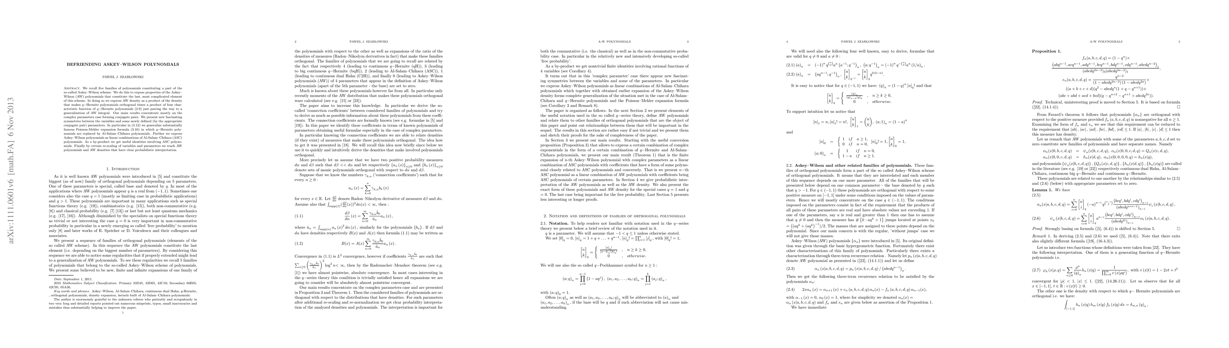 We recall five families of polynomials constituting a part of the so-called Askey-Wilson scheme. We do this to expose properties of the Askey-Wilson (AW) polynomials that constitute the last, most complicated element of this scheme. In doing so we express AW density as a product of the density that makes $q-$Hermite polynomials orthogonal times a product of four characteristic function of $q-$Hermite polynomials (\ref{fAW}) just pawing the way to a generalization of AW integral. Our main results concentrate mostly on the complex parameters case forming conjugate pairs. We present new fascinating symmetries between the variables and some newly defined (by the appropriate conjugate pair) parameters. In particular in (\ref% {rozwiniecie1}) we generalize substantially famous Poisson-Mehler expansion formula (\ref{PM}) in which $q-$Hermite polynomials are replaced by Al-Salam-Chihara polynomials. Further we express Askey-Wilson polynomials as linear combinations of Al-Salam-Chihara (ASC) polynomials. As a by-product we get useful identities involving ASC polynomials. Finally by certain re-scaling of variables and parameters we reach AW polynomials and AW densities that have clear probabilistic interpretation.