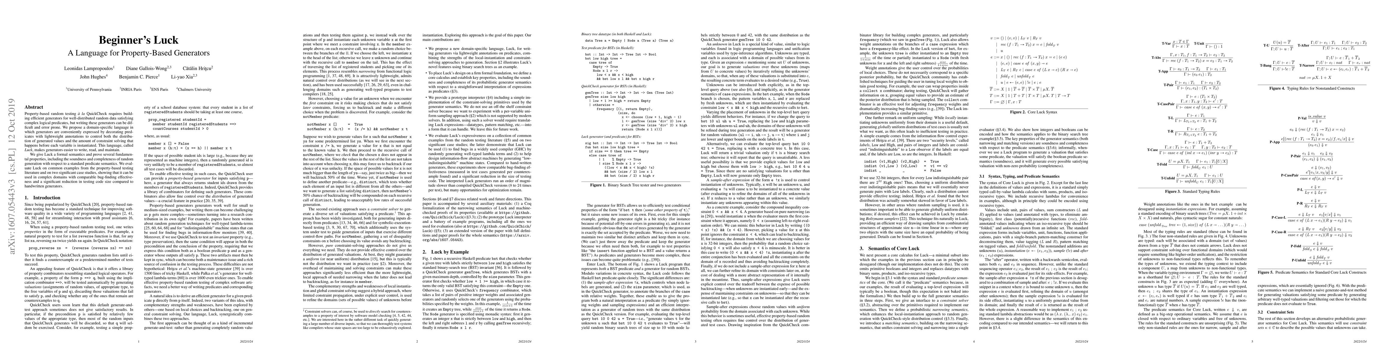 Property-based random testing a la QuickCheck requires building efficient generators for well-distributed random data satisfying complex logical predicates, but writing these generators can be difficult and error prone. We propose a domain-specific language in which generators are conveniently expressed by decorating predicates with lightweight annotations to control both the distribution of generated values and the amount of constraint solving that happens before each variable is instantiated. This language, called Luck, makes generators easier to write, read, and maintain. We give Luck a formal semantics and prove several fundamental properties, including the soundness and completeness of random generation with respect to a standard predicate semantics. We evaluate Luck on common examples from the property-based testing literature and on two significant case studies, showing that it can be used in complex domains with comparable bug-finding effectiveness and a significant reduction in testing code size compared to handwritten generators.