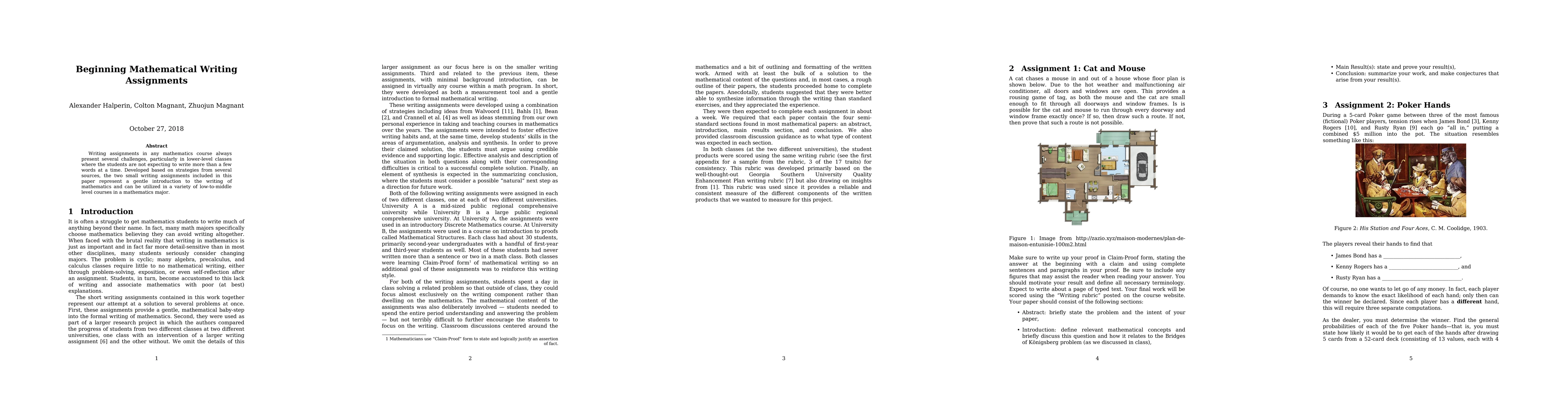 Writing assignments in any mathematics course always present several challenges, particularly in lower-level classes where the students are not expecting to write more than a few words at a time. Developed based on strategies from several sources, the two small writing assignments included in this paper represent a gentle introduction to the writing of mathematics and can be utilized in a variety of low-to-middle level courses in a mathematics major.