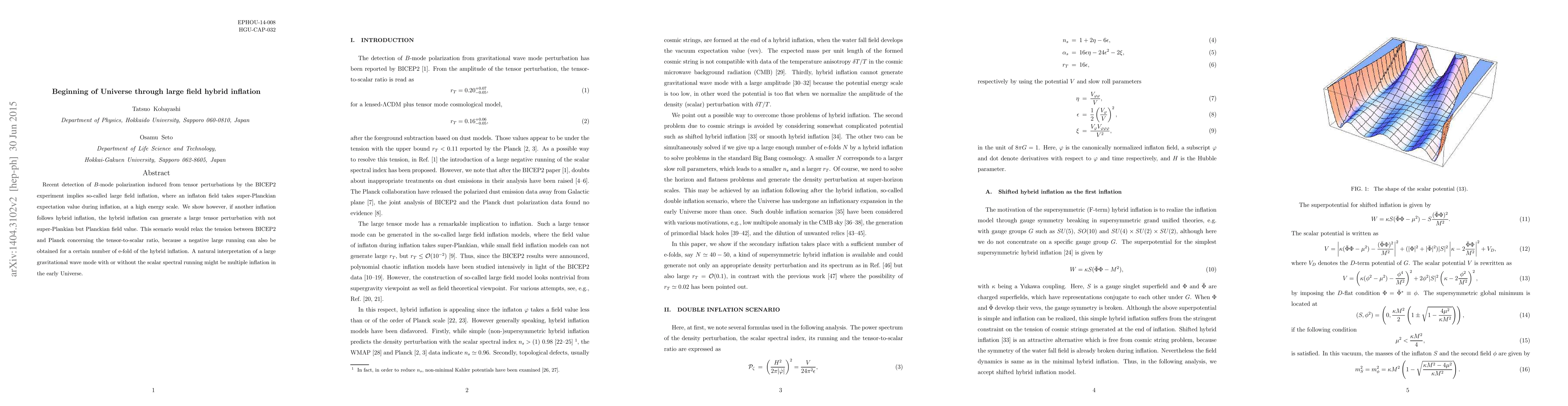 Recent detection of $B$-mode polarization induced from tensor perturbations by the BICEP2 experiment implies so-called large field inflation, where an inflaton field takes super-Planckian expectation value during inflation, at a high energy scale. We show however, if another inflation follows hybrid inflation, the hybrid inflation can generate a large tensor perturbation with not super-Plankian but Planckian field value. This scenario would relax the tension between BICEP2 and Planck concerning the tensor-to-scalar ratio, because a negative large running can also be obtained for a certain number of e-fold of the hybrid inflation. A natural interpretation of a large gravitational wave mode with or without the scalar spectral running might be multiple inflation in the early Universe.