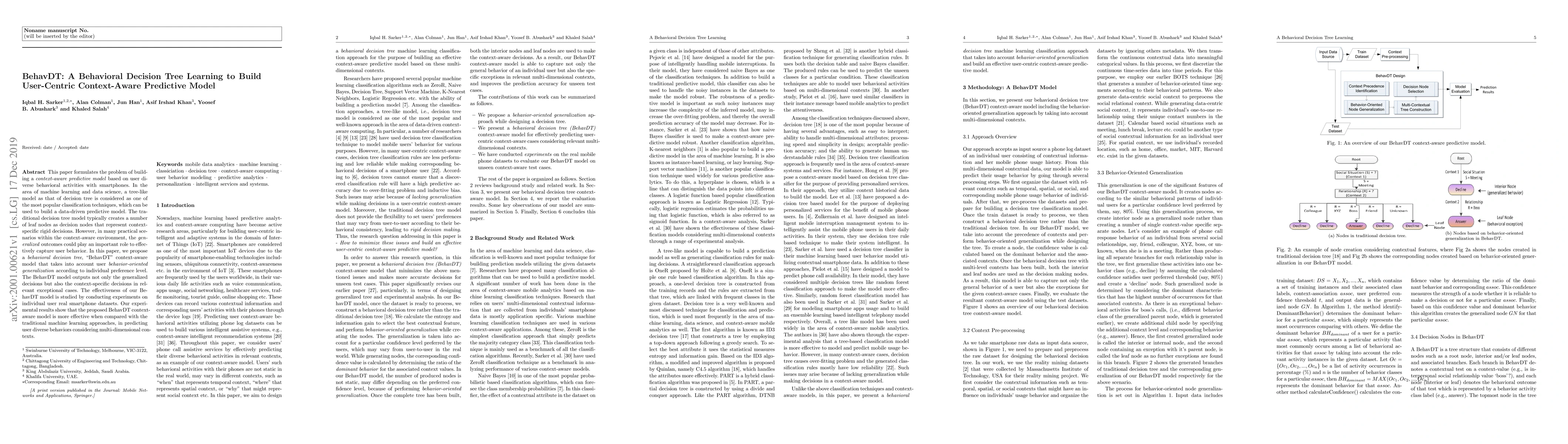 This paper proposes BehavDT, a behavioral decision tree model for building context-aware predictive models based on user smartphone activities. Unlike traditional decision trees, BehavDT incorporates user behavior-oriented generalization to avoid overfitting and effectively capture diverse user behaviors in context-aware environments. Experimental results show that BehavDT outperforms traditional methods in predicting user behaviors across multiple contexts.