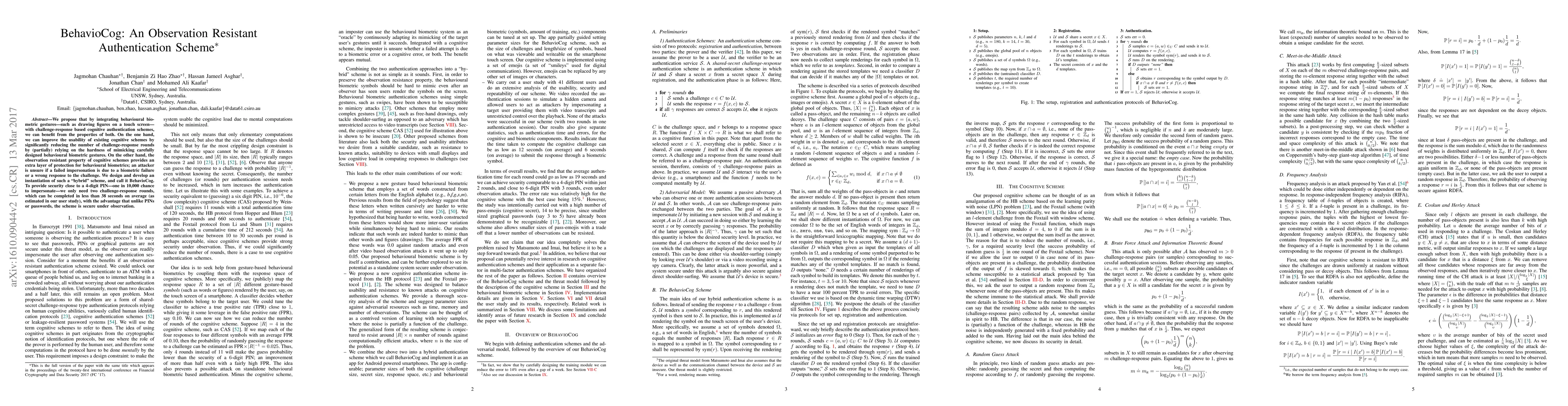 BehavioCog combines behavioral biometrics with cognitive authentication to achieve 4-digit PIN-like security in just two challenge-response rounds, providing an additional layer of protection against observation attacks.