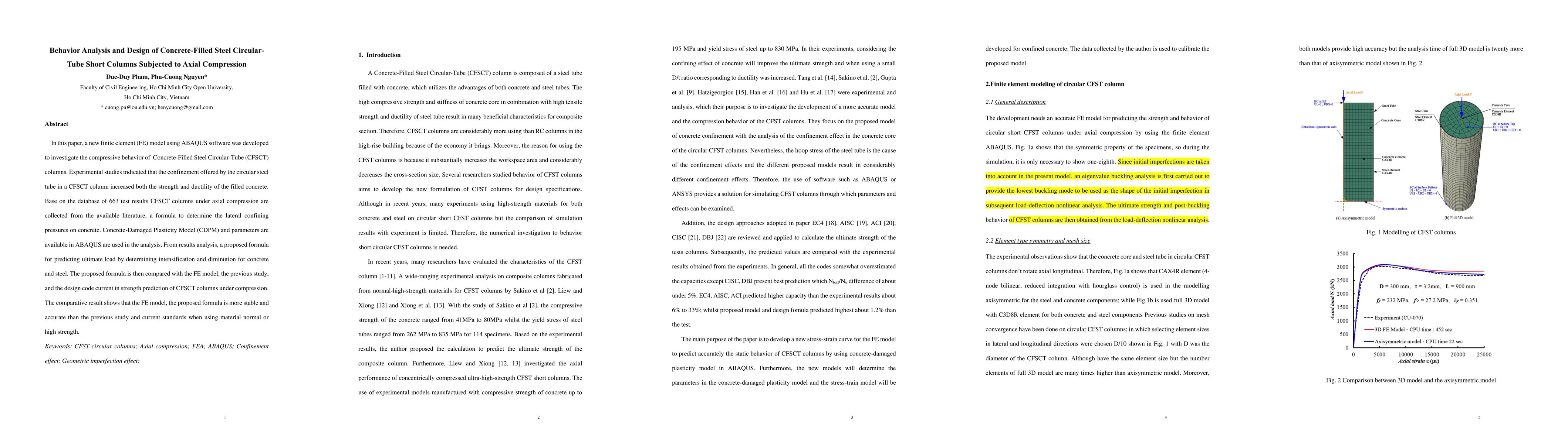 In this paper, a new finite element (FE) model using ABAQUS software was developed to investigate the compressive behavior of Concrete-Filled Steel Circular-Tube (CFSCT) columns. Experimental studies indicated that the confinement offered by the circular steel tube in a CFSCT column increased both the strength and ductility of the filled concrete. Base on the database of 663 test results CFSCT columns under axial compression are collected from the available literature, a formula to determine the lateral confining pressures on concrete. Concrete-Damaged Plasticity Model (CDPM) and parameters are available in ABAQUS are used in the analysis. From results analysis, a proposed formula for predicting ultimate load by determining intensification and diminution for concrete and steel. The proposed formula is then compared with the FE model, the previous study, and the design code current in strength prediction of CFSCT columns under compression. The comparative result shows that the FE model, the proposed formula is more stable and accurate than the previous study and current standards when using material normal or high strength.
