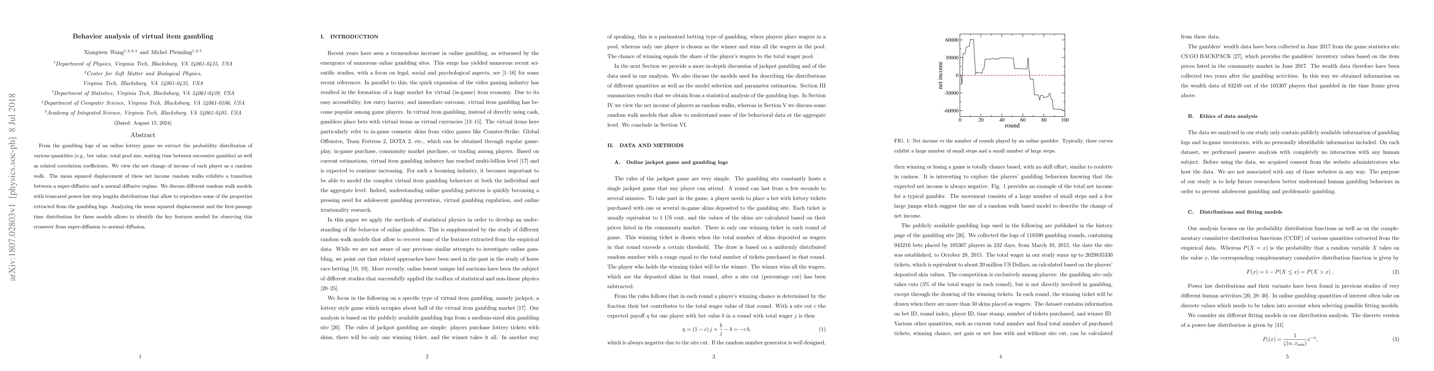 From the gambling logs of an online lottery game we extract the probability distribution of various quantities (e.g., bet value, total pool size, waiting time between successive gambles) as well as related correlation coefficients. We view the net change of income of each player as a random walk. The mean squared displacement of these net income random walks exhibits a transition between a super-diffusive and a normal diffusive regime. We discuss different random walk models with truncated power-law step lengths distributions that allow to reproduce some of the properties extracted from the gambling logs. Analyzing the mean squared displacement and the first-passage time distribution for these models allows to identify the key features needed for observing this crossover from super-diffusion to normal diffusion.