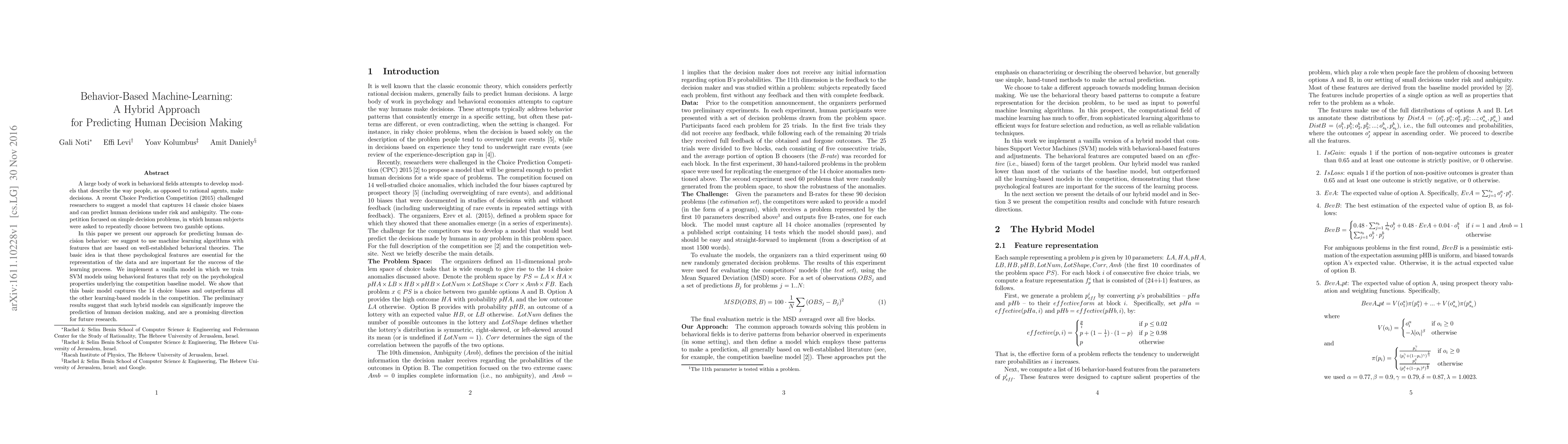 This paper proposes a hybrid machine-learning approach using behavioral features grounded in psychological theories to predict human decision-making, outperforming other models in a 2015 competition focused on choice biases under risk and ambiguity. The results indicate that integrating psychological insights into machine learning can significantly enhance the accuracy of human decision predictions.