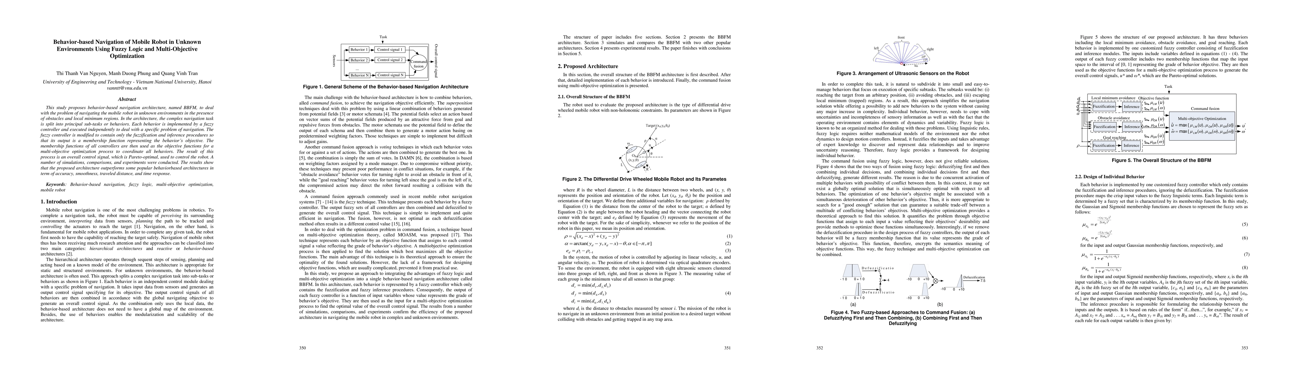 This study proposes behavior-based navigation architecture, named BBFM, to deal with the problem of navigating the mobile robot in unknown environments in the presence of obstacles and local minimum regions. In the architecture, the complex navigation task is split into principal sub-tasks or behaviors. Each behavior is implemented by a fuzzy controller and executed independently to deal with a specific problem of navigation. The fuzzy controller is modified to contain only the fuzzification and inference procedures so that its output is a membership function representing the behavior's objective. The membership functions of all controllers are then used as the objective functions for a multi-objective optimization process to coordinate all behaviors. The result of this process is an overall control signal, which is Pareto-optimal, used to control the robot. A number of simulations, comparisons, and experiments were conducted. The results show that the proposed architecture outperforms some popular behavior-based architectures in term of accuracy, smoothness, traveled distance, and time response.